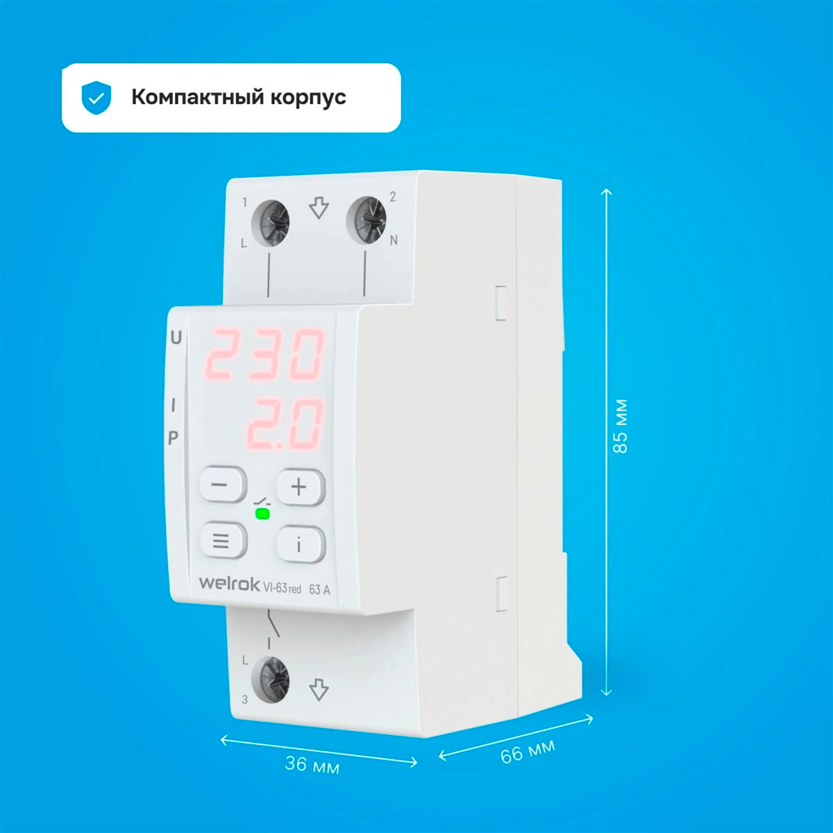TrueRMS для точного измерения напряженияРеле напряжения с контролем тока Welrok VI red защищает оборудование от скачков и провалов напряжения, последствий обрыва нулевого провода и превышения тока или мощности. Реле отключает нагрузку, если напряжение, ток или мощность выходит за установленные пределы и автоматически включает нагрузку, когда значение параметра вернется в норму. Welrok VI red - компактное реле на 2 модуля с мощным функционалом:Позволяет выбрать, по какому из параметров - ток или мощность - будет срабатывать защита вместе с защитой по напряжению.Скорость срабатывания реле < 0,03 сек.