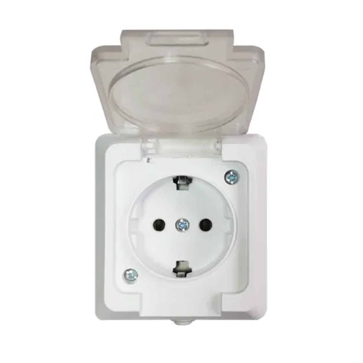 Розетка с заземлением и прозрачной крышкой защищает от влаги и пыли, обеспечивая безопасное использование даже в сложных условиях.
