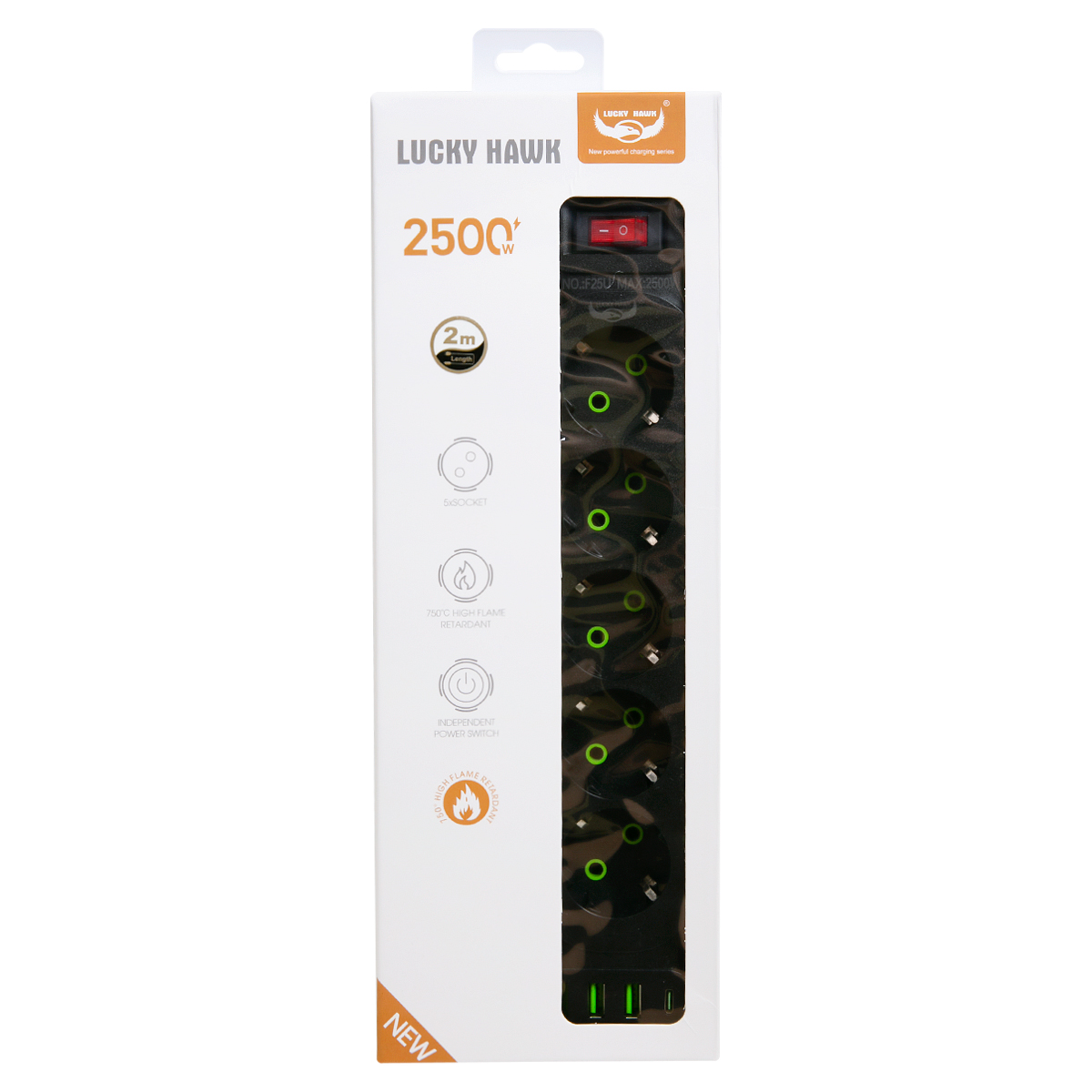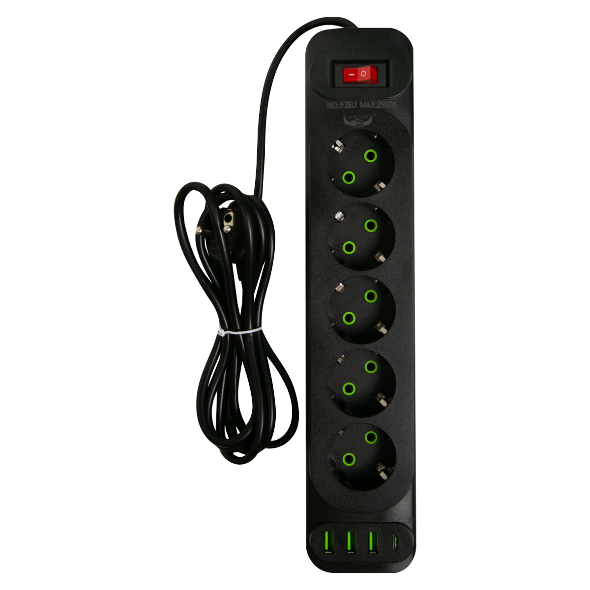 Сетевой фильтр с выключателем – это универсальное устройство, которое включает в себя 3 USB-порта, 1 разъём типа Type-C и 5 розеток под стандартные электрические вилки на 220 В. Длина кабеля составляет 2 метра. 1 разъём типа Type-C обеспечивает силу тока 2,1 А, 3 USB-порта – по 2,1 А каждый, а 5 розеток предназначены для подключения приборов и техники. Корпус обладает повышенной защитой от возгорания до 750 градусов Цельсия. Максимальная нагрузка составляет 10 А / 2500 Вт.Безопасный европейский разветвитель-пилот с выключателем позволяет подключать приборы с большой мощностью, своевременно срабатывает при перегреве. Предусмотрено заземление и предохранитель, что обеспечивает высокий уровень безопасности. Сетевой фильтр с защитой станет вашим идеальным и безопасным помощником дома, на кухне, на работе, на даче и в гараже.Материал корпуса: пластикЦвет: черныйРазмеры удлинителя (г/ш/а): 3.5 х 6.5 х 32 смРазмер упаковки (г/ш/а): 5 х 12.5 х 34.5 см