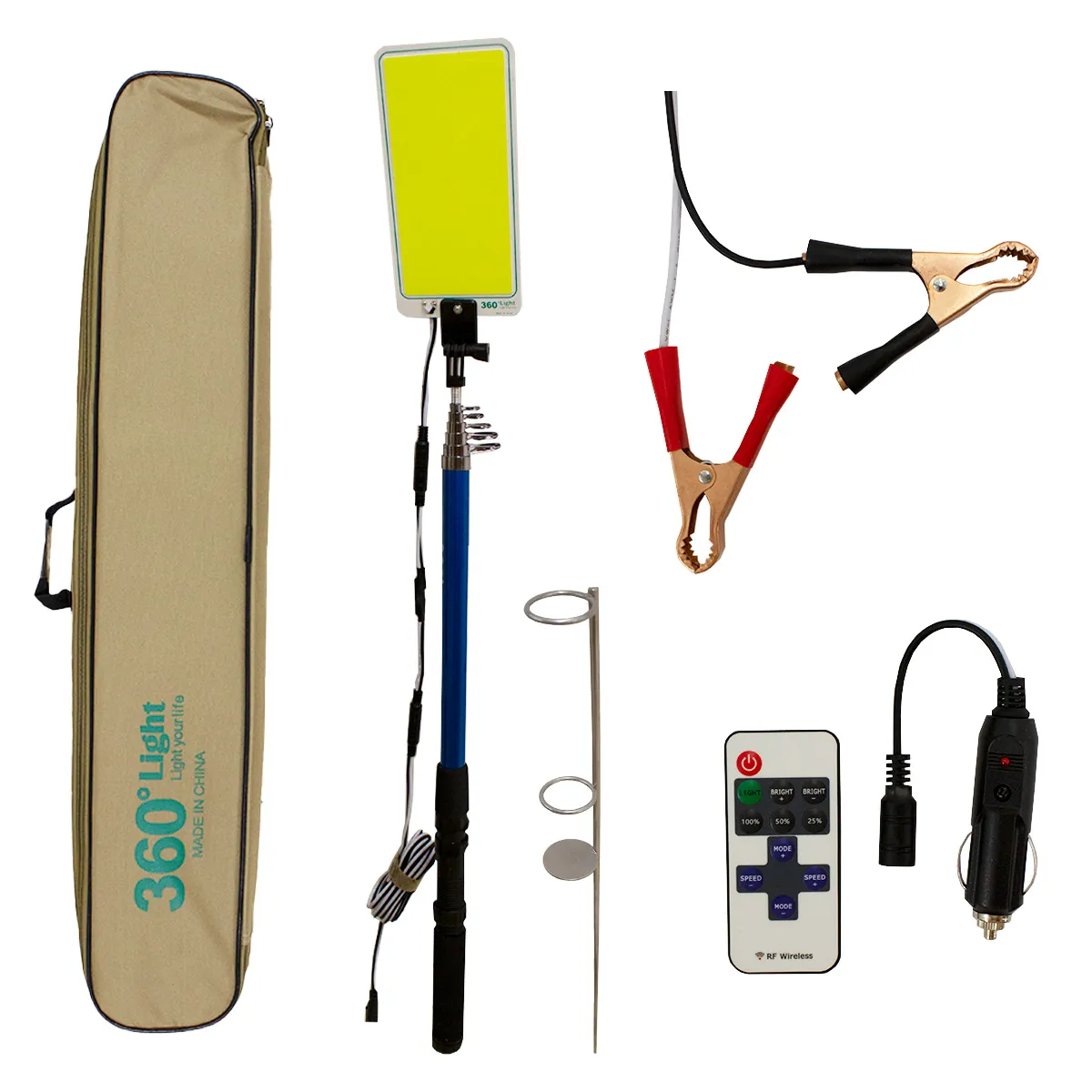 Светильник, оборудованный яркими COB диодами, предоставляет мощное освещение на высоте до 4,5 метров, благодаря удлиняющейся стойке, сделанной в виде удочки, надежно фиксирующейся на земле. Светильник подключается при помощи зажимов ("крокодилов") к автомобильному аккумулятору или через прикуриватель. Пульт дистанционного управления позволяет легко регулировать яркость и режимы освещения. Все это хранится в удобном чехле для удобства транспортировки и хранения.Размеры светильника: 227х12х2ммРазмеры чехла: 750х130х70мм