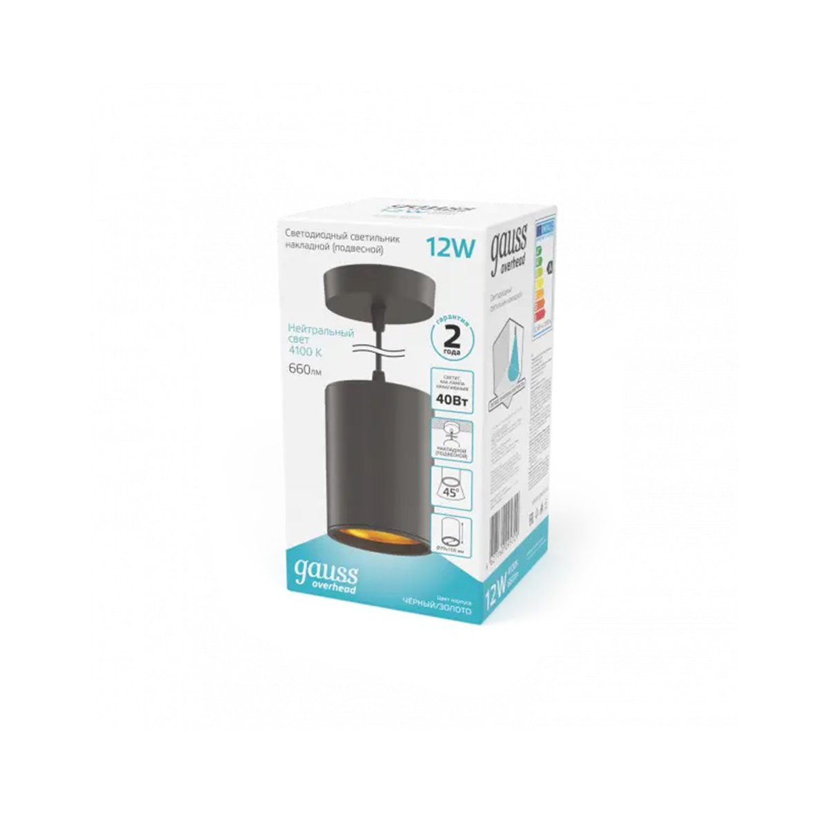 —Светильник Gauss Overhead подвес цил12W 750lm 4100K 170-240V IP20 79*100мм черный золото LED 1/20