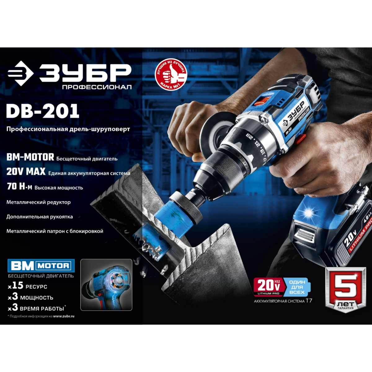 Бесщеточная дрель-шуруповерт ЗУБР Профессионал DB-201-22 предназначена для сверления отверстий в различных материалах (при установке сверла), а также для монтажа / демонтажа резьбовых соединений (при установке соответствующих бит и головок). Быстрозажимной металлический патрон обеспечивает максимально простую замену оснастки.Комплектация:дрель-шуруповерт, 2 аккумулятора, кейс, зарядное устройство, дополнительная рукоятка, бита, поясная скобаНапряжение изделия, В: 20Частота вращения шпинделя, об/мин: 0-500/0-1800Число скоростей: 2Жесткий крутящий момент, Н×м: 70Мягкий крутящий момент, Н×м: 35Кол-во ступеней крутящего момента: 23+1Макс диаметр сверления (дерево), мм: 45Макс диаметр сверления (металл), мм: 13Тип аккумулятора: Li-IonЕмкость аккумулятора, А·ч: 2.0Съемная батарея: естьТип патрона: быстрозажимнойРазмер патрона, мм: 1.5-13Электронная регулировка частоты вращения: естьЗащита от перегрузок: есть