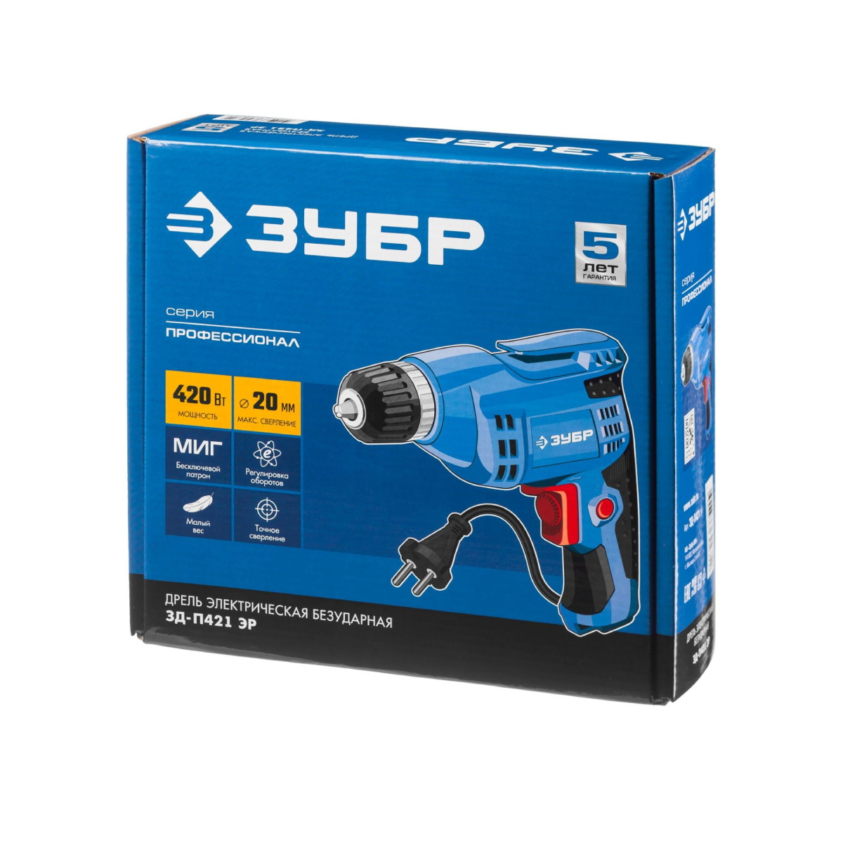 Дрель ЗУБР ПРОФЕССИОНАЛ ЗД-П421 ЭР обладает надежной конструкцией. Применяется для точного сверления отверстий в различных материалах. Также имеется возможность заворачивания крепежных изделий при установке соответствующей оснастки.Комплектация:Дрель 1 шт.Руководство по эксплуатации 1 экз.Характеристики:Тип инструмента: безударныйМощность: 420 ВтМакс. число оборотов холостого хода: 03300 об/минМакс. диаметр сверления (дерево): 20Макс. диаметр сверления (металл): 10Тип патрона: быстрозажимнойДиаметр патрона: 0,810 ммПосадка патрона: 3/8 дюймРежимы работы: сверлениеКоличество скоростей работы: 1Реверс: естьПоддержание постоянных оборотов под нагрузкой: нетМеталлический корпус редуктора: нетЭлектронная регулировка частоты вращения: естьБыстрая замена щеток: нетАвтоматически отключающиеся при износе щетки: нетФиксация кнопки включения: естьОграничитель глубины сверления: нетДополнительная рукоятка: нетКейс в комплекте: нетНапряжение питания: 220±10% /50 В/ГцГабариты: 25.8x25.5x7 смМасса изделия: 1,3 кгМасса в упаковке: 1,6 кг