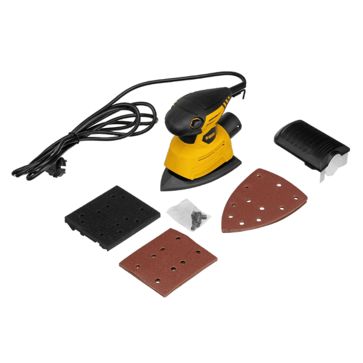 Плоскошлифовальная вибрационная машина 2 в 1 Denzel VDS-2 27614 мощностью 130 Вт и частотой вибраций 14000 об/мин используется для сухого шлифования плоских поверхностей и деталей из древесины, пластмассы, металла. Имеет возможность установки прямоугольной или треугольной подошвы для работы в труднодоступных местах и углах, что позволяет эффективно решать поставленные задачи. ПреимуществаВысокая производительность – величина хода платформы составляет 2,5 мм, размер рабочей поверхности – 100 х 110 мм и 151 х 150 х 100 мм, поэтому машина успешно справляется с обработкой большой площади.Легкая подготовка к работе – система VELCRO позволяет быстро крепить абразивный материал.Эффективная работа и чистота на рабочем месте – машина оборудована системой пылеудаления.Работа в непрерывном режиме – конструкцией предусмотрен фиксатор кнопки пуска.Безопасность пользователя – токопроводящие элементы имеют усиленную двойную изоляцию.Простое обслуживание – пластиковый пылесборник легко снимать и чистить.Длина сетевого кабеля 3 м – можно свободно перемещаться по рабочей зоне.Готовность к работе – в комплект входит 2 набора шлифовальной бумаги для прямоугольной и треугольной подошв, а также запасные угольные щётки.Комфортная работа – машина весит всего 1,2 кг, обрезиненная рукоятка поглощает вибрации и не выскальзывает из рук.Электронная регулировка скорости: нетНоминальная мощность, Вт: 130Длина кабеля, м: 3Напряжение сети, В: 230Размер подошвы, мм:150х150х100 / 100х110Частота колебаний подошвы, кол/мин: 14000
