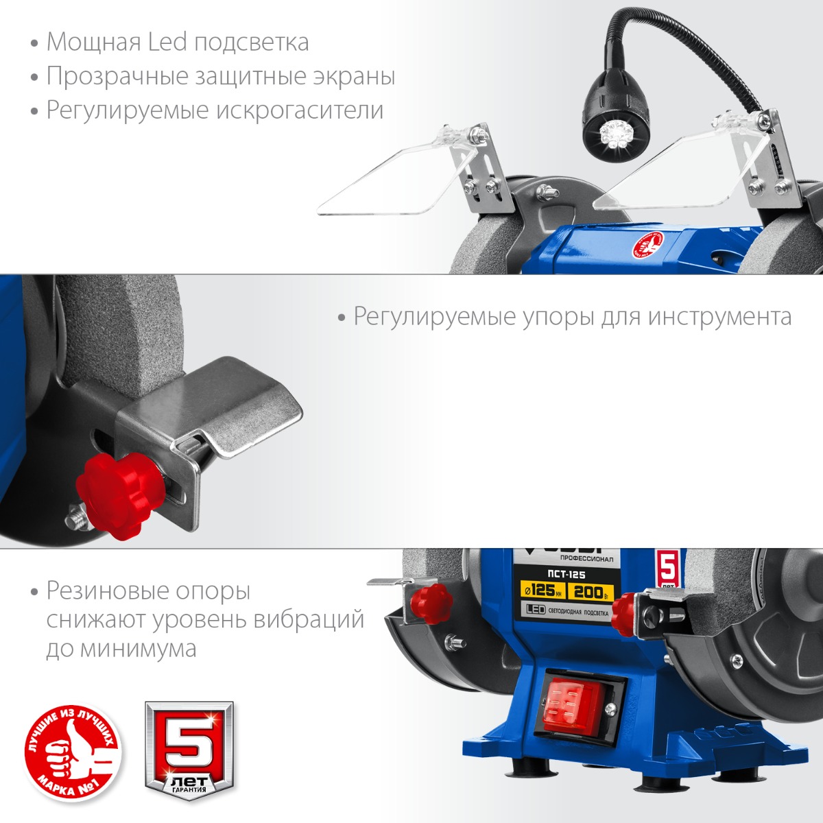 Профессиональный инструмент для мастерской и мелкосерийного производства. Увеличенный ресурс двигателя, повышенная точность установки заточных кругов, опорные подшипники высокого качества, компактный размер, два круга с разной зернистостью.Преимущества:Двигатель большой мощности выполнить даже самую тяжелую работу2 круга разной зернистости для любых работАсинхронный двигатель, не требующий обслуживания весь срок службыLED подсветка рабочей зоныПрозрачные экраны для защиты оператора от продуктов обработкиПылезащищенный выключатель для беспроблемной эксплуатацииВозможность крепления к опорной поверхностиРегулируемый упор для инструмента.Применение: для заточки и сухой шлифовки металлических заготовок и режущего инструмента.Характеристики:Тип станка: ЗаточнойТип электродвигателя: АсинхронныйМощность, Вт: 200Частота вращения, мин-1: 2950Диаметр круга, мм: 125Диаметр посадочного отвверстия, мм: 32Толщина точильного круга, мм: 20Зернистость круга №1: 60Зернистость круга №2: 80Пылезащитный выключатель: естьЗащитные экраны: естьПодсветка: естьРежим работы: S2, 30 минНапряжение питания, В / Гц: ~ 230/50Масса изделия, кг: 4.7Гарантия 1 год.