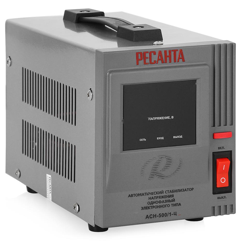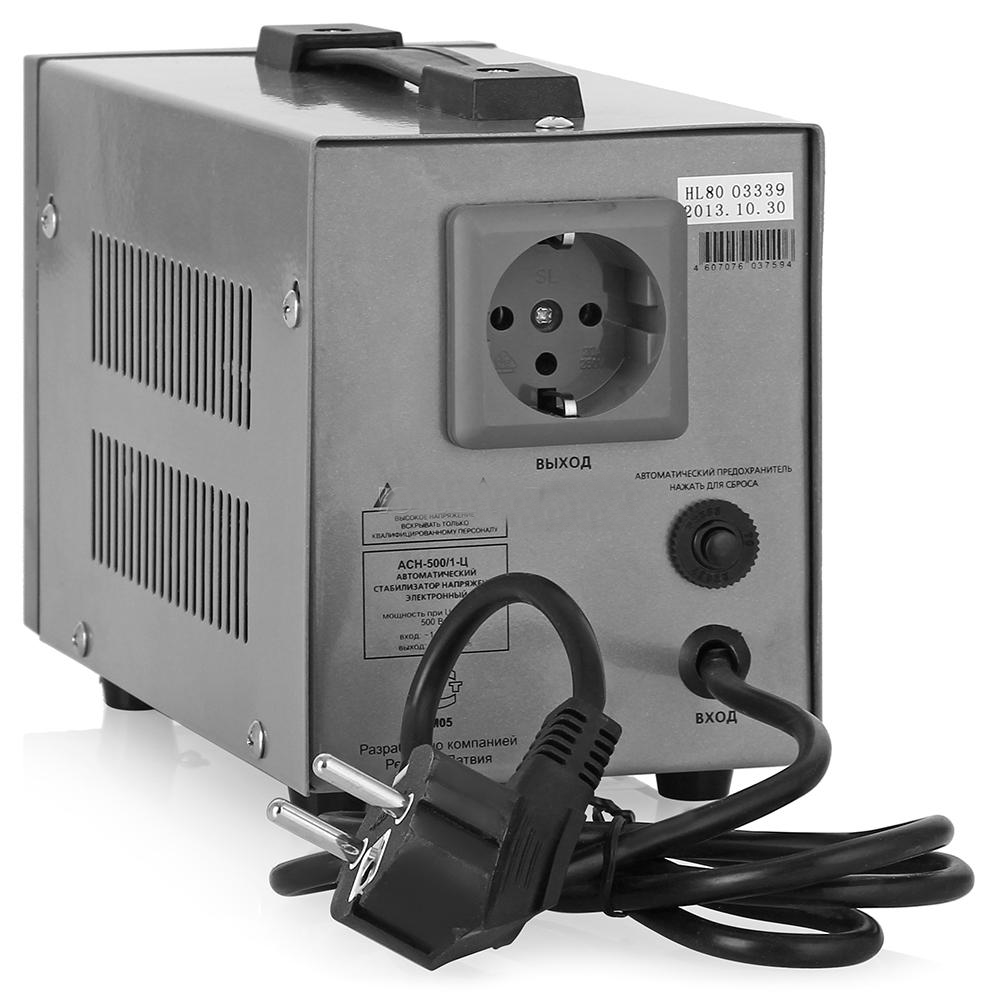 Скачки напряжения электросети, нестабильное по значению напряжение сети, короткое замыкание, сетевые помехи – вам знакомы эти слова? Если нет, то это все то, что может привести к выходу из строя ваших любимых электроустройств и электрооборудования. Так же вам необходимо будет знать, что повышение напряжения всего на 10 % сокращает срок службы ваших электрических помощников примерно в четыре раза. Теперь вам известно, если вы не знали этого ранее, что стабильное питание бытовых приборов – это очень важный аспект в их надежной и долгосрочной работе. Что же поможет справиться со всеми этими недостатками запитки устройств непосредственно от электросети? Выход, конечно же, уже придуман – использование при подключении стабилизаторов напряжения, устройств, которые поддерживают на выходе стабильное напряжение с определенной погрешностью.Внешний вид Ресанта АСН-500/1-Ц Торговая марка "Ресанта", которая является крупнейшим производителем электротехнического оборудования и в частности стабилизаторов напряжения, предлагает своим покупателям линейку стабилизаторов Ресанта АСН-/1-Ц, отличающихся привлекательным соотношением цены и качества. В серию входит одиннадцать типономиналов стабилизаторов, разработанных в соответствии с международными стандартами и различающихся по максимальным значениям мощности и тока. В линейке представлены стабилизаторы напряжения, рассчитанные на номинальную мощность от 500 Вт до 20 кВт.Далее остановимся более подробно на стабилизаторе Ресанта АСН-500/1-Ц, который является самым маломощным представителем этой серии и рассчитан на значение мощности 0,5 кВт при условии, что входное напряжение будет более 190 В. Стабилизатор такой мощности превосходно подойдет для подключения отдельных потребителей малой мощности.АСН-500/1-Ц представляет собой электронный стабилизатор напряжения, предназначенный для применения в однофазных сетях переменного тока.Как они работают?Из сказанного выше уже понятно, что стабилизаторы напряжения обеспечивают стабильное напряжение на выходе при изменениях входного. Электронные же стабилизаторы в основе своей работы подразумевают дискретное изменение выходного напряжения, как реакцию на изменение входного. Дискретность или ступенчатость изменения выходного напряжения объясняется применением автотрансформатора, который в своем составе имеет большое количество повышающих и понижающих обмоток, а так же коммутирующие реле. Если значение напряжения на входе изменяется, реле подключается к определенной обмотке, что обеспечивает напряжение на выходе в пределах допустимого диапазона. Управляет всем этим процессом логическое устройство, которое контролирует напряжение на входе и определяет на какую из обмоток необходимо совершить перекоммутацию ключа.Ресанта АСН-500/1-ЦРесанта АСН-500/1-Ц - вид сзади Стабилизация напряжения дискретным способом в электронных стабилизаторах осуществляется с достаточно высокой точностью, и у АСН-500/1-Ц погрешность выходного напряжения 220 В составляет всего ± 8 %. Скорость же реакции – время за которое происходит выравнивание выходного напряжения, у стабилизаторов этого типа и вовсе заставляет восхититься, так как находиться на уровне (25 – 35) мс. Входное напряжение может изменятся в пределах от 140 до 260 В – в этом диапазоне стабилизатор будет но