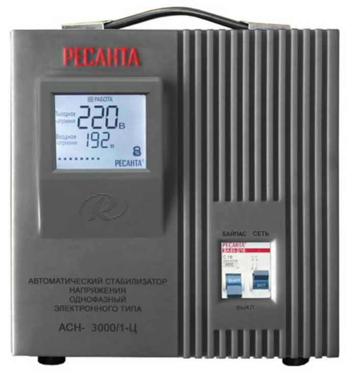 Вам доводилось выбрасывать дорогостоящие электроустройства или электрооборудование из-за того, что они вышли из строя, в следствии скачков напряжения в сети или короткого замыкания? Нет, значит вам крупно повезло. Уже немало людей обожглось на этом, ведь электроснабжение очень нестабильно. Те же, кто задумывается о своих электрических помощниках, уже давно сделали выбор в пользу применения стабилизаторов напряжения, которые устраняют нестабильность напряжения сети и обеспечивают качественное электропитание. Использование стабилизатора при запитке, как домашних электроустройств, так и электрооборудования на работе позволит обеспечить их качественную службу в течение длительного времени.Внешний вид Ресанта АСН-3000/1-Ц Российская компания "Ресанта", являющаяся лидером в области производства электротехнического оборудования, к которому, несомненно, стоит отнести и стабилизаторы напряжения, представляет на рынке серию стабилизаторов Ресанта АСН-/1-Ц, отличающихся превосходным качеством и относительно невысокой стоимостью в сравнении с конкурентами. Линейка представлена одиннадцатью типономиналами стабилизаторов, каждый из которых имеет собственное максимальное значение мощности и тока. Серия состоит из стабилизаторов, номинальное значение мощности которых варьируется от 0,5 до 20 кВт.Далее речь пойдет о модели стабилизатора Ресанта АСН-3000/1-Ц, рассчитанной, как можно легко догадаться, на максимальную мощность потребителей 3 кВт в том случае, если входное напряжение будет превышать 190 В. Итак, АСН-3000/1-Ц – это стабилизатор напряжения релейного типа, который можно применять в однофазных цепях переменного тока, с целью стабильного питания электроустройств с суммарной мощностью не более 3 кВт.Релейный тип стабилизаторов напряженияТеперь несколько слов о том, как же и за счет чего, собственно, стабилизатор выравнивает выходное напряжение. Как уже было сказано выше, АСН-3000/1-Ц, как и вся линейка, относится к стабилизаторам, в основе работы которых заложен дискретный принцип регулирования напряжения на выходе. Это говорит о том, что за стабильность напряжения на выходе отвечает автотрансформатор, имеющий большое количество повышающих и понижающих обмоток, реле и микропроцессор. Напряжение из сети измеряется и сравнивается микропроцессором с выходным, и выдается команда реле подключить обмотку, которая сможет обеспечить требуемое напряжение на выходе с учетом допустимой погрешности.Ресанта АСН-3000/1-ЦДискретная коррекция выходного напряжения, осуществляемая за счет подключения различных обмоток, обладает достаточно высокой точностью, и для данной модели стабилизированное напряжение 220 В выдается с погрешностью ± 8 %. Этого вполне достаточно для комфортной работы почти всех бытовых приборов. Гораздо важнее, что время регулировки стабилизаторов, работающих по этому принципу, находиться на очень высоком уровне и составляет порядка (25 – 35) мс, а это является просто превосходным показателем. Напряжение электросети, при котором стабилизатор может выполнять свои функции, находится в диапазоне (140 – 260) В. Стабилизатор в своем составе имеет ряд защит, как то, защита от пониженного и повышенного напряжения на входе, защита от перегрузки, защита от короткого замыкания. Итак, если напряжение на входе начинает снижаться и достиг