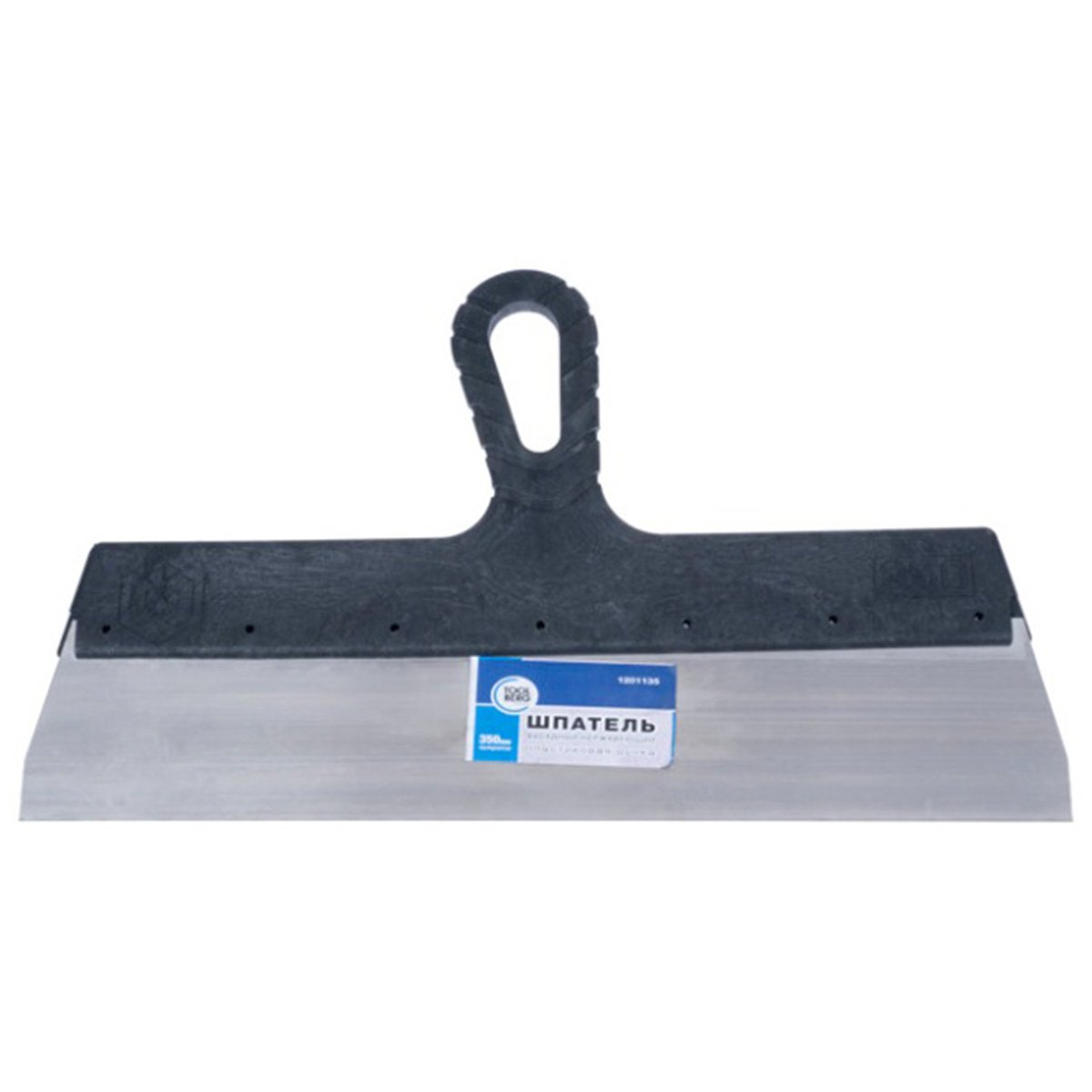 Этот шпатель имеет ширину рабочей части 350 мм, что делает его удобным для равномерного распределения штукатурок, клеевых растворов, шпаклёвок и других строительных композиций на стенах и фасадах. Большая ширина позволяет покрывать значительные площади за меньшее количество проходов, экономя время и усилия при работе с вертикальными и горизонтальными поверхностями.