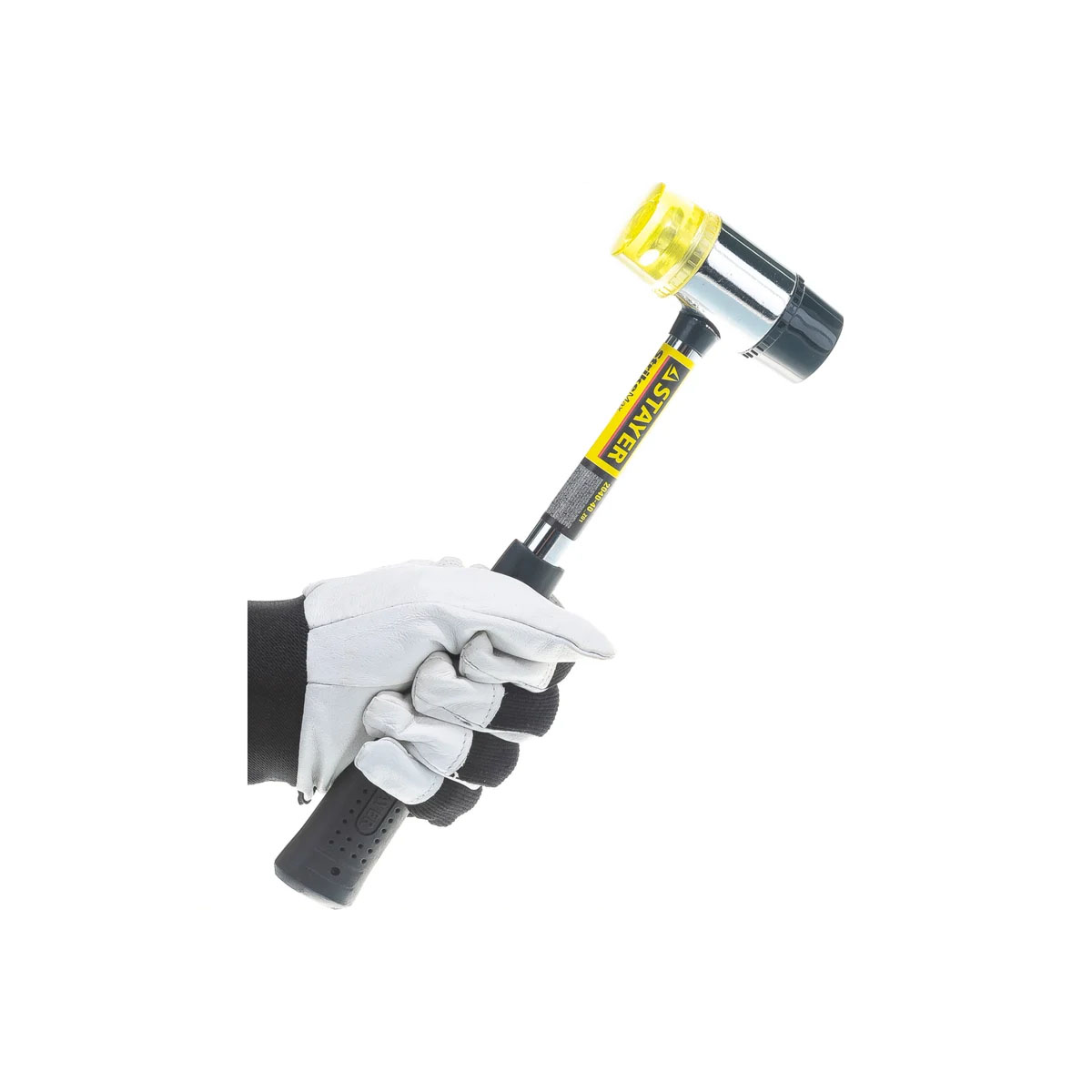 Многофункциональный сборочный молоток 40мм STAYER MASTER 2040-40_z01 - удобный, надежный и долговечный в работе ручной рихтовочный инструмент высокого качества, который служит для восстановления повреждений на металлических поверхностях. Рукоятка изготовлена из прочного металла и оснащена прорезиненной накладкой. Ударная часть снабжена двумя бойками различной твердости, которые легко поддаются замене при необходимости. Длина молотка составляет 305 мм.
