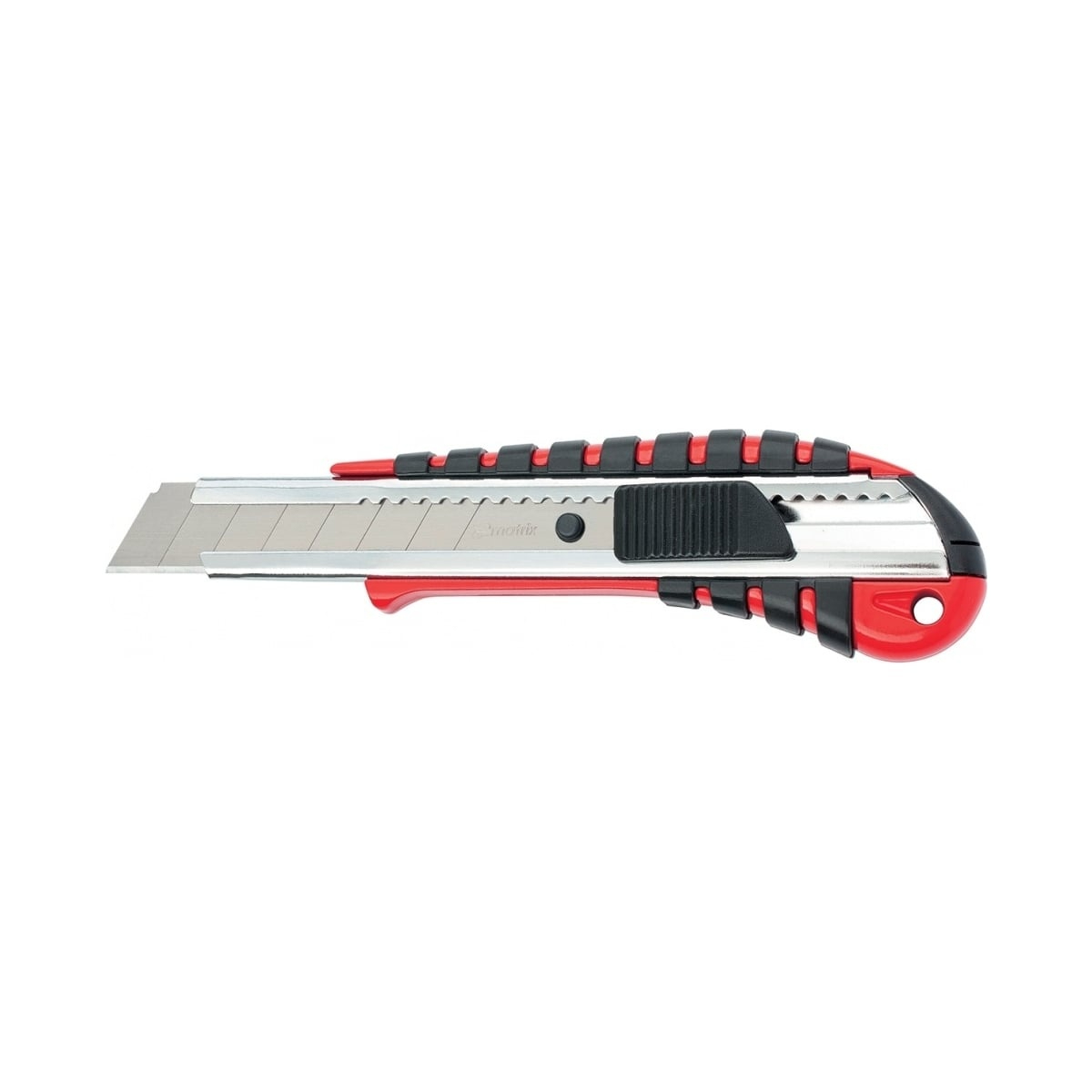 Нож Matrix 78938 с выдвижным лезвием шириной 18 мм, металлической направляющей и эргономичной двухкомпонентной рукояткой пригодится в мастерской, для бытового использования, проведения ремонтных работ, а также для рукоделия. Он с легкостью разрезает бумагу, картон и более плотные материалы, например, кожаные изделия.Прочность и твердость – лезвие выполнено из стали 60.Металлическая направляющая – корпус защищен от повреждений.Сегментированное лезвие – его часть можно легко отломить, если режущая кромка потеряла остроту.Эргономичный корпус с обрезиненными рукоятками – руки не устают даже при интенсивном использовании.