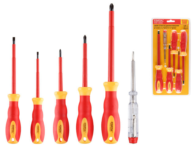Назначение: набор отверток диэлектрических для монтажа и демонтажа резьбовых соединений, находящихся под напряжением до 1000VКомплект: SL4.0х0.8х100мм, SL5.5х1.0х125мм, PH1х80мм, PH2х100мм, PH3х150мм, индикатор напряжения (тестер)Описание: имеют изоляционное покрытие стержня. Материал стержня Cr-V. Двухкомпонентная противоскользящая рукоятка. Наконечники намагничены