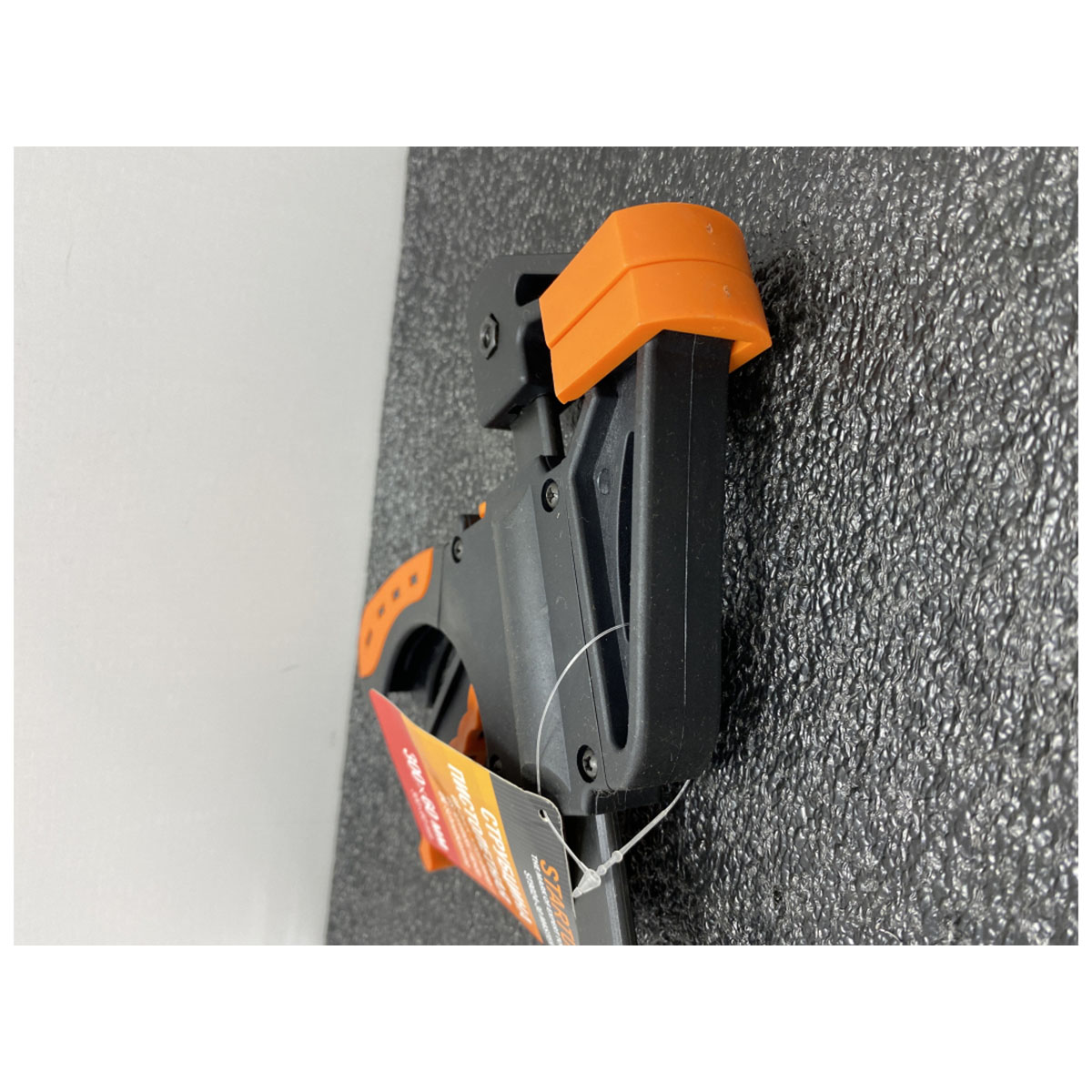 Назначение: применяется для надежной фиксации предметов во время склеивания, сборки или обработки; Ширина зажима, мм: 300; Глубина зажима, мм: 60; Максимальное зажимное усилие, Н: 600; Материал корпуса: ударопрочный пластик; Материал направляющей: сталь; Рабочие губки: снабжены накладками для предотвращения повреждений обрабатываемых предметов; Особенность: опорная губка перемещается и фиксируется по всей длине направляющей при помощи рукоятки, а также может переставляться на другой конец направляющей, что позволяет использовать струбцину
