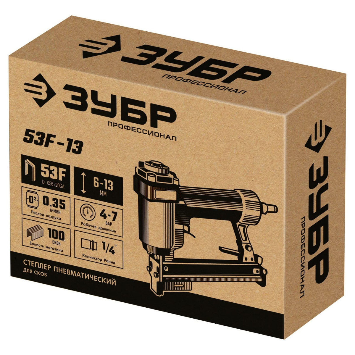 Пневматический степлер для скоб представляет собой профессиональный пневматический скобозабиватель, произведенный из высококачественных материалов. Позволяет быстро и эффективно выполнить свою работу. Предусмотрена обрезиненная рукоятка для удобства хвата.ПреимуществаЛитой алюминиевый корпусОбрезиненная рукоятка для удобства хватаПростота в использованииБольшой магазин на 100 скобУстойчив к перегреву, пожаробезопасенНизкое потребление воздуха на ударХарактеристики:Подходящая расходка: скобыТип скоб: 53F/D/56/73/20GAДиаметр воздушного штуцера, дюйм: 1/4MТип соединения: рапид (EURO)Вес: 1.25 кгРазмер скоб, мм: 6 - 13Количество скоб в магазине, шт.: 100Средний расход воздуха, л/мин: 0,31