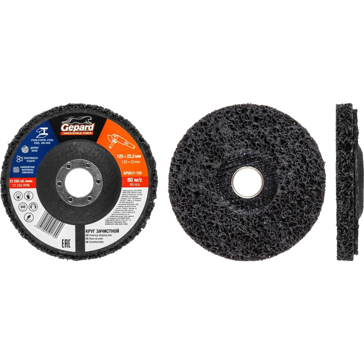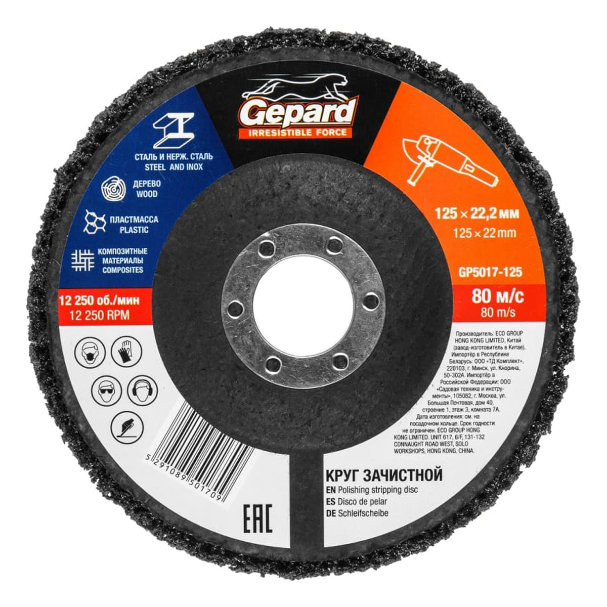 Круг зачистной 125x22 мм Gepard GP5017-125 предназначен для мягкой очистки поверхности от ржавчины, коррозии, старой краски, герметиков, клея, эпоксидных покрытий и других загрязнений. Не снимает металл и не изменяет форму. Используется в УШМ соответствующего типоразмера. Сухая шлифовка.Материал: пористая структура из нейлонового волокна с абразивным слоем из карбида кремния, нетканая основа, обод из инструментальной стали.Оборотов в минуту: 12250 RPM.Максимальная окружная скорость: 80 м/с.Технические характеристики круга зачистной Gepard GP5017-125Тип: круг шлифовальныйДиаметр: 125 ммПосадочный диаметр: 22.2 ммТолщина: 15 ммТип диска: шлифовальныйВид абразива: карбид кремнияНазначение: универсальныйКоличество в упаковке: 1 штФорма: прямойТип крепления: зажимУстановка: на фланец
