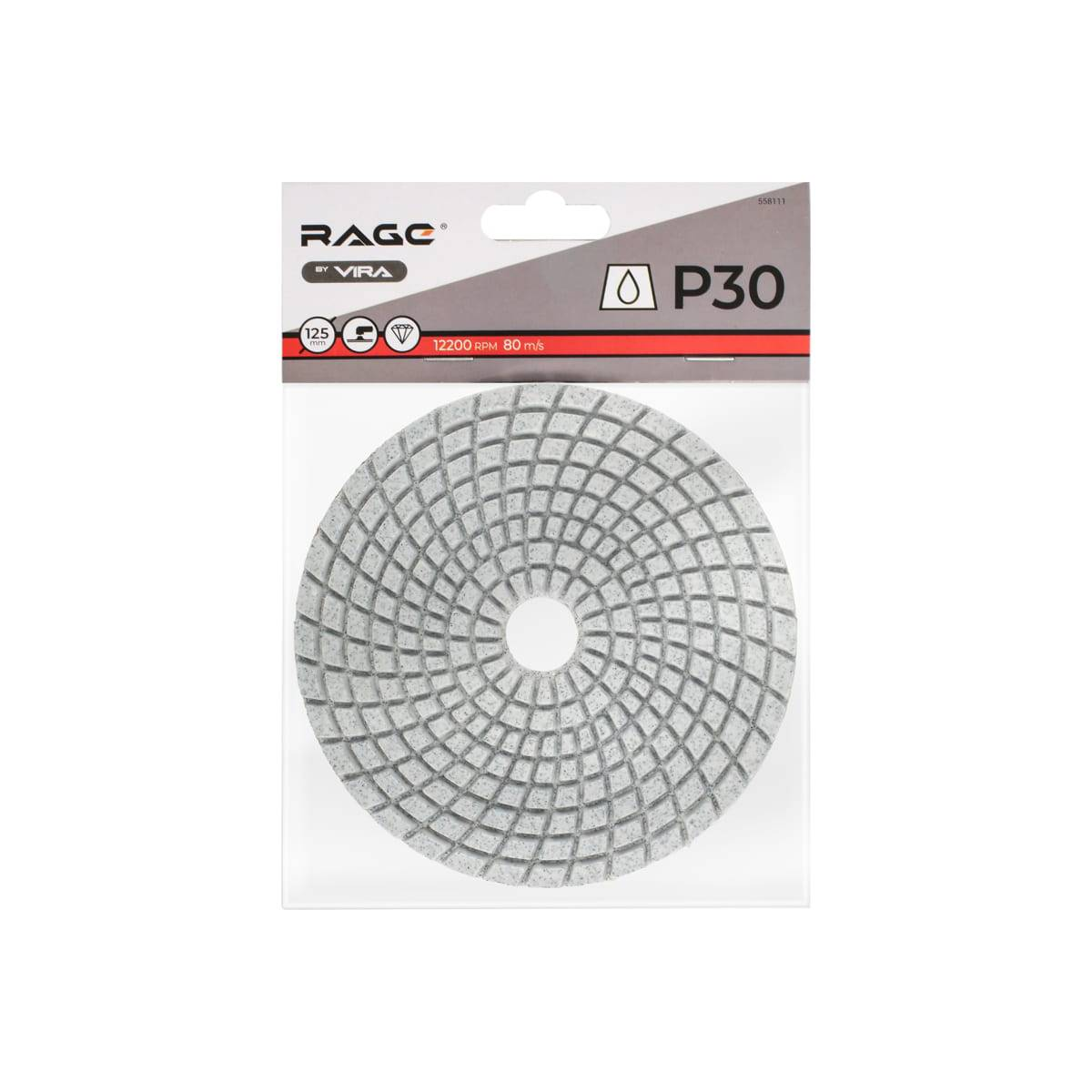 Алмазный гибкий шлифовальный круг Р30 мокрое шлифование RAGE by VIRA: Мокрое шлифование (с водяным охлаждением).Для грубой обработки, первичной шлифовки всех разновидностей искусственного и натурального камня, включая высокопрочные породы.Используется с эксцентриковыми шлифмашинками, УШМ, дрелями.Алмазное напыление.Фиксация липучкой.Диаметр – 125 мм.Высота сегмента – 2.7 мм.Толщина диска – 5 мм.Мax обороты – 4500 об./ мин.Зернистость Р30.Круг алмазный гибкий шлифовальный подходит для выполнения точных работ. Высокий ресурс и надежность этого инструмента, дают возможность получить гладкие поверхности на большом объеме обрабатываемых материалов. Круг моментально устанавливается на опорную чашку и, по необходимости, легко заменяется.Обратите внимание: чем крупнее зерно (самое крупное Р30), тем быстрее происходит процесс шлифовки и грубее обрабатывается поверхность.