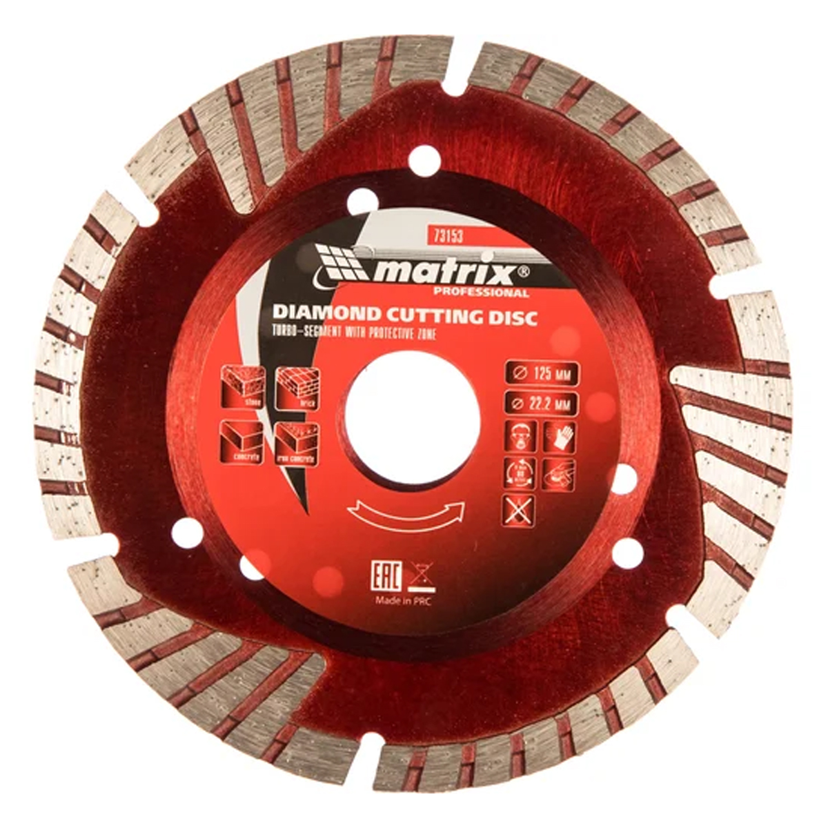 Диск алмазный отрезной сегментный Matrix 73153 с защитными секторами, 125 х 22,2 мм, применяется для сухой резки бетона разной прочности, камня, кирпича, шлакоблока и тротуарной плитки. Он используется как оснастка для углошлифовальных машин с соответствующим посадочным диаметром. Диск изготовлен методом холодного прессования и выдерживает повышенные нагрузки при прохождении арматуры в слабоармированном железобетоне.Технические характеристики отрезного сегментного алмазного диска MATRIX 73153Диаметр: 125 ммТип диска: алмазныйВид диска: турбосегментированныйПосадочный диаметр: 22.2 ммТолщина: 2.5 ммТип: по бетонуТип реза: сухой (с СОЖ и без)Высота алмазного слоя: 7 ммТип: по бетону