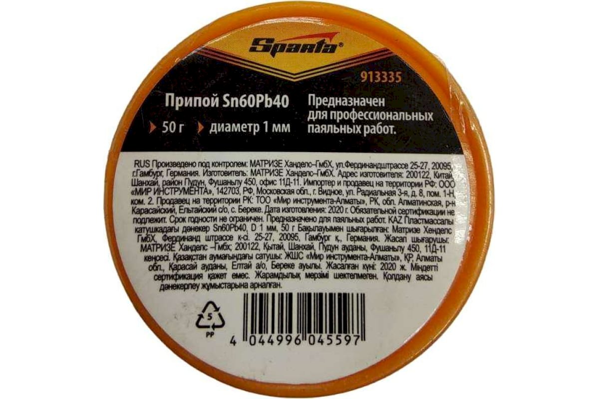Припой Sn60Pb40 Sparta 913335 диаметром 1 мм, 50 г, на пластмассовой катушке, применяется для паяльных работ. Легкоплавкий припой надежно соединяет детали из меди и нержавеющей стали. Его используют во время монтажа или ремонта радиоэлектронной аппаратуры.Вид припоя: мягкий(легкоплавкий)Сечение/диаметр: 1 ммТемпература пайки: 182 °СДля пайки алюминия6 нетДля пайки меди: даДля пайки серебра: нетДля пайки нержавеющей стали: даДля пайки латуни: даСостав: Sn60/Pb40Форма: проволока без флюса