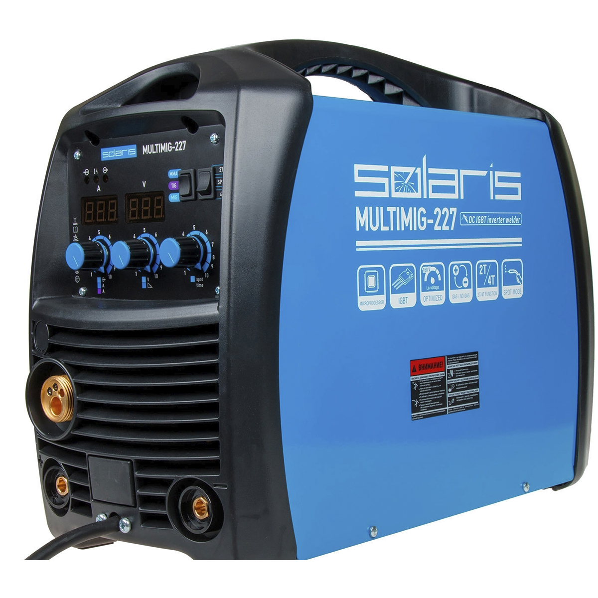 Аппарат оснащен ЕВРО-разъемом, горелкой MIG 3 метра и возможностью смены полярности для сварки проволокой без газа (FLUX).Режим точечной сварки SPOT идеально подойдет для сварки тонколистового металла (например кузовов автомобилей). Необходимо настроить время сварки одной точки, и после этого все точечные швы будут сварены одинаково хорошо и качественно.Особенности Solaris MULTIMIG-227:Горелка 3 м с ЕВРО-разъемом;3 в 1 (MIG / MMA / TIG lift DC);Микропроцессорное управление;Аппарат работает на 6 IGBT-транзисторах, что делает его более надежным решением;Высокая продолжительность включения аппарата 60% при 20°С;Размер устанавливаемой катушки до 5 кг / 200 мм;Возможность смены полярности для сварки проволокой без газа (FLUX);Стабильная работа в сетях с пониженным напряжением (от 160В);Режим 2Т/4Т (для MIG);Режим сварки SPOT (сварка точками с длительностью от 0,1 до 10 секунд);Регулировка интенсивности форсажа дуги (MMA).Комплектация:Сварочный аппарат MULTIMIG 227 - 1 шт Горелка MIG/MAG MB 15 AK (евроразъем), 3 м - 1 шт Клемма заземления с кабелем Электрододержатель с кабелемФирменный гарантийный талон.Инструкция по эксплуатации.