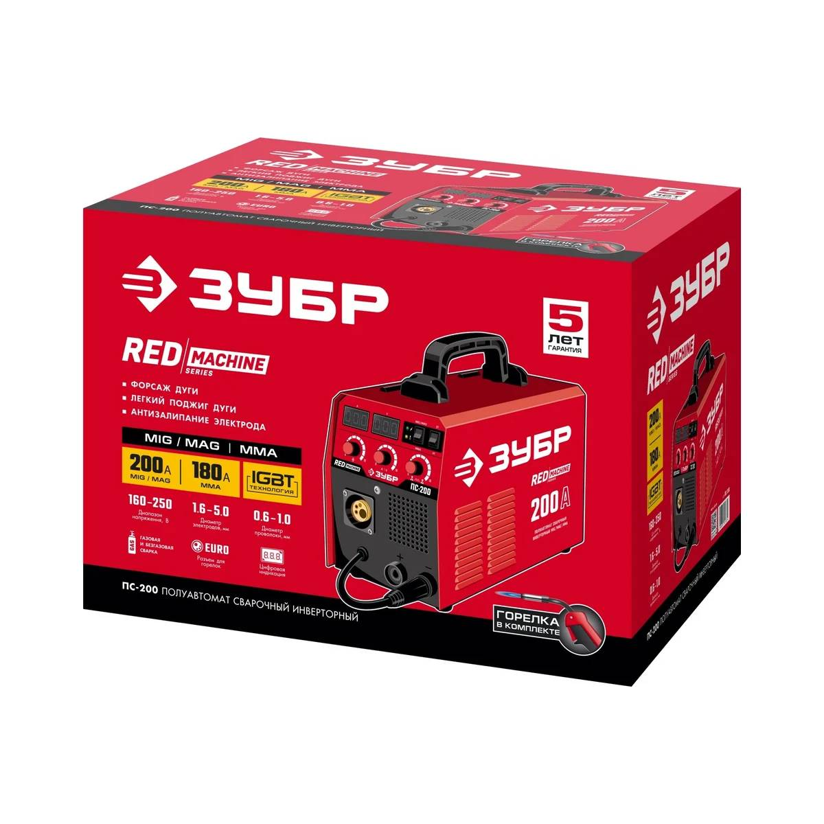 ЗУБР 30-200 А, MIG/MAG/MMA, сварочный аппарат, инверторный, полуавтоматический ПС-200Полуавтомат сварочный инверторный ЗУБР ПС-200, предназначен для работы в режимах MIG/MAG-сварки и ММА-сварки. Сварочный полуавтомат по технологии IGBT: плавная регулировка сварочного тока и напряжения в широком диапазоне; малое потребление электроэнергии, высокий КПД; сварка различных металлов, в том числе сталь и алюминий; меньшее количество силовых элементов. Высокая производительность за счет автоматической подачи проволоки. Работа с различными типами проволоки. Возможность использования катушки до 5 кг. Подключение горелки через евро-разъем. Система защиты от перегрева. Оснащен функцией "Горячий старт", функция "Форсаж дуги", функция "Антиприлипание электрода" автоматически снижает сварочный ток в момент залипания электрода. Защита от пыли. Электронный дисплей для контроля процесса сварки. Устойчивая работа при колебаниях сетевого напряжения до 160 В. Принудительное охлаждение и встроенная защита от перегрева.Комплектация:Аппарат сварочный - 1 шт. Горелка MIG/MAG - 1 шт. Кабель с клеммой заземления - 1 шт. Руководство по эксплуатации - 1 экз.Габариты и вес в упаковке:Длина: 47 смШирина: 34 смВысота: 31 смВес в упаковке: 13.7 кгТехнические характеристики:Напряжение: В 220Степень защиты: IP21SMax ток: А 200Наличие сетевой вилки: естьПВ на максимальном токе: % 60Min ток: А 30Напряжение холостого хода: В 60Диаметр электрода/проволоки: мм 1.6-5.0/0.6-0.8TIG сварка: нетMax мощность: кВт 5.12