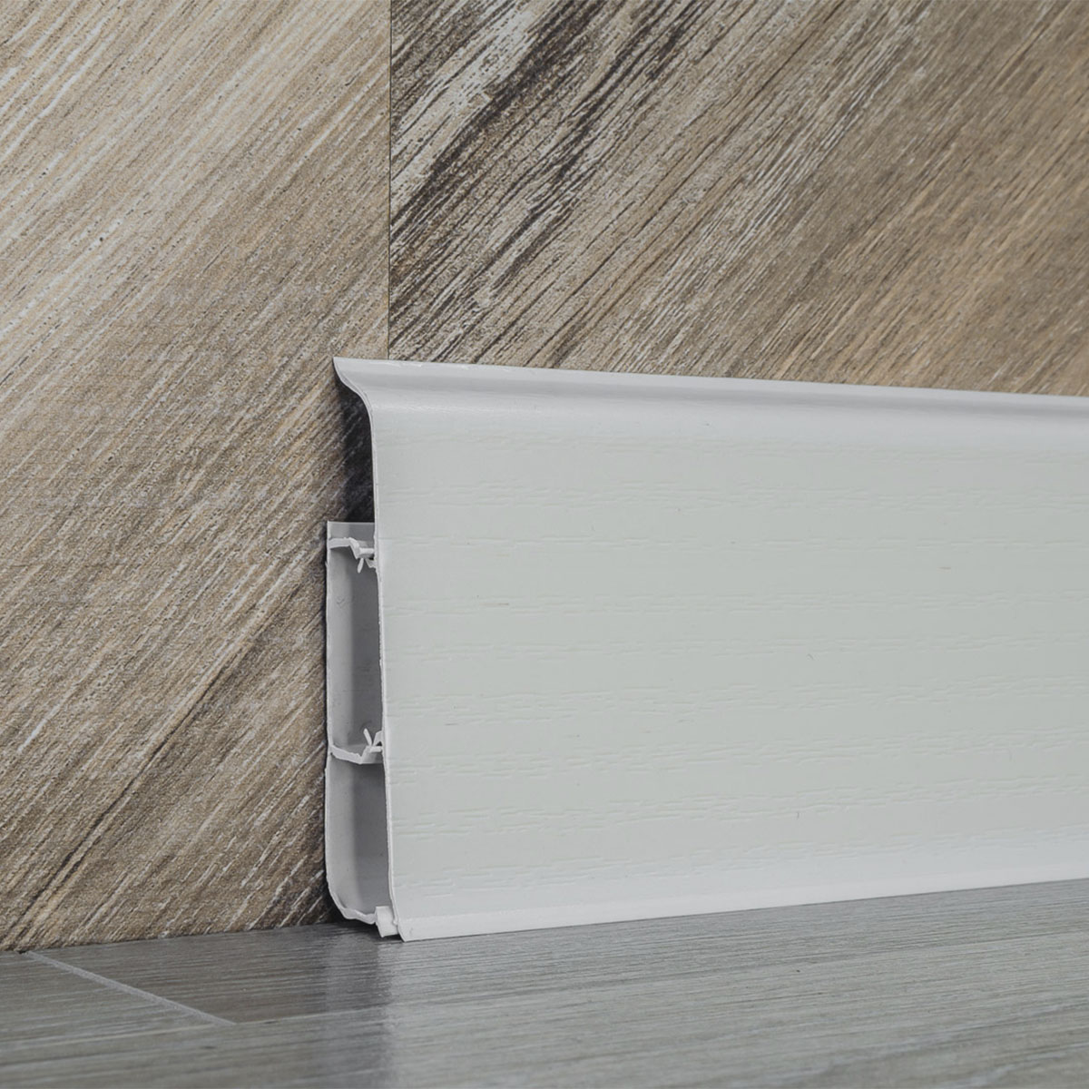 Плинтус скроет шов между стеной и полом, защитит напольное покрытие от пыли и влаги и придаст интерьеру законченность. Служит для прокладки кабелей вдоль стен. Мягкий край обеспечивает плотное прилегание плинтуса к полу и стене. ПВХ плинтус можно устанавливать на неровные стены. Плинтус не испортится от частого мытья или бытовой химии. Фурнитура на усилителях надежно держится. Этот пластиковый плинтус имеет вместительный кабель-канал. Плинтус состоит из двух частей: одна крепится к стене, а другая надевается сверху.Материал: пластик.Цвет: кремово-белый.Высота: 70 мм.