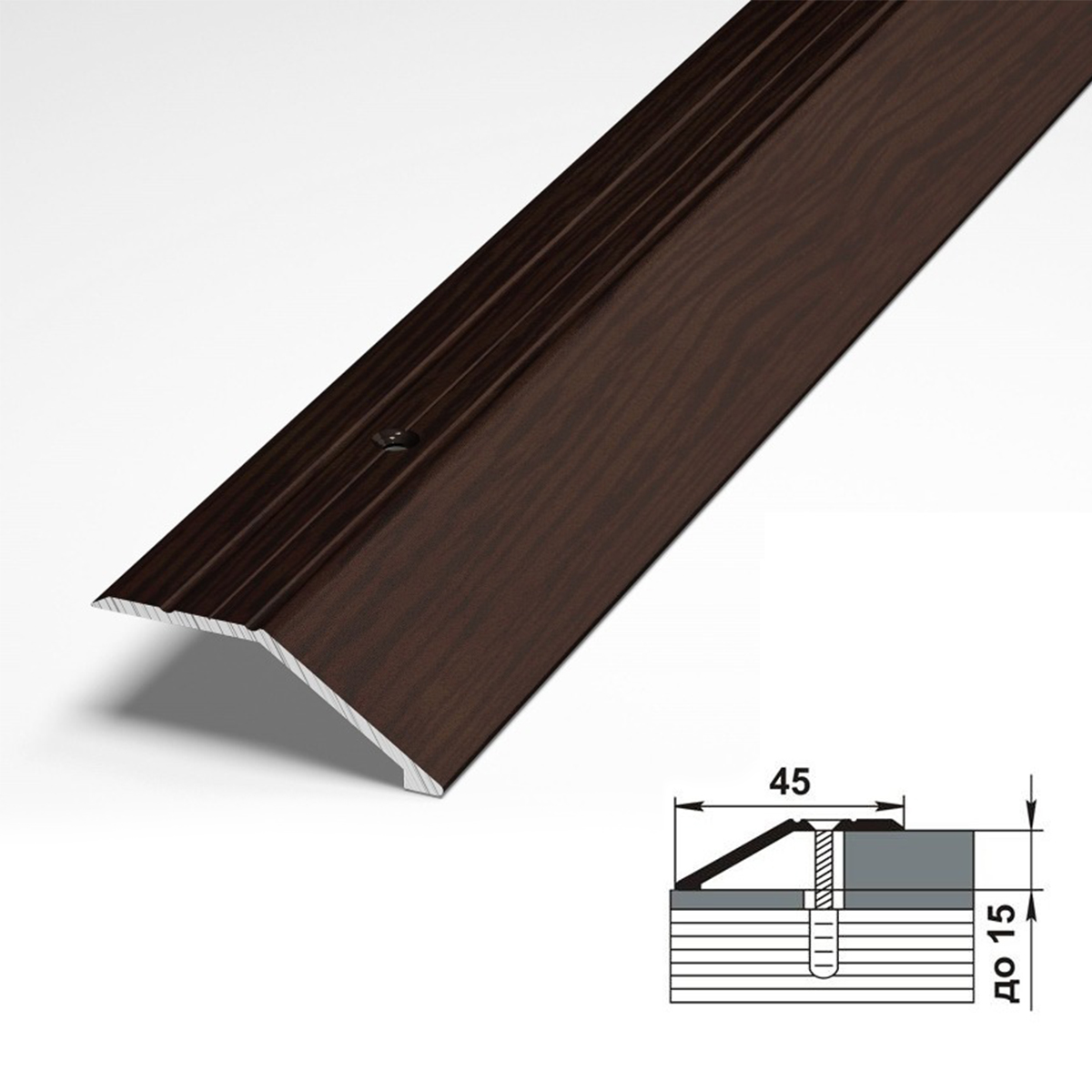 Разноуровневый порожек из алюминия. Длина 1800 мм, ширина 45 мм.Профиль служит для декоративной стыковки двух разноуровневых напольных поверхностей с перепадом до 15 мм.Преимущества:поможет аккуратно скрыть зазор между напольными покрытиямипрочный материал - алюминийизносостойкое анодированное покрытиепростой монтаж на саморезымножество вариантов декорированиялегко подобрать под паркет и ламинатобеспечит безопасное хождение по полузащитит от скопления пыли и грязи в дверном проемесаморезы и дюбели в комплектевыгодная ценаСпособ монтажа: алюминиевый порожек крепится в проем между двумя напольными покрытиями на саморезы (идут в комплекте).