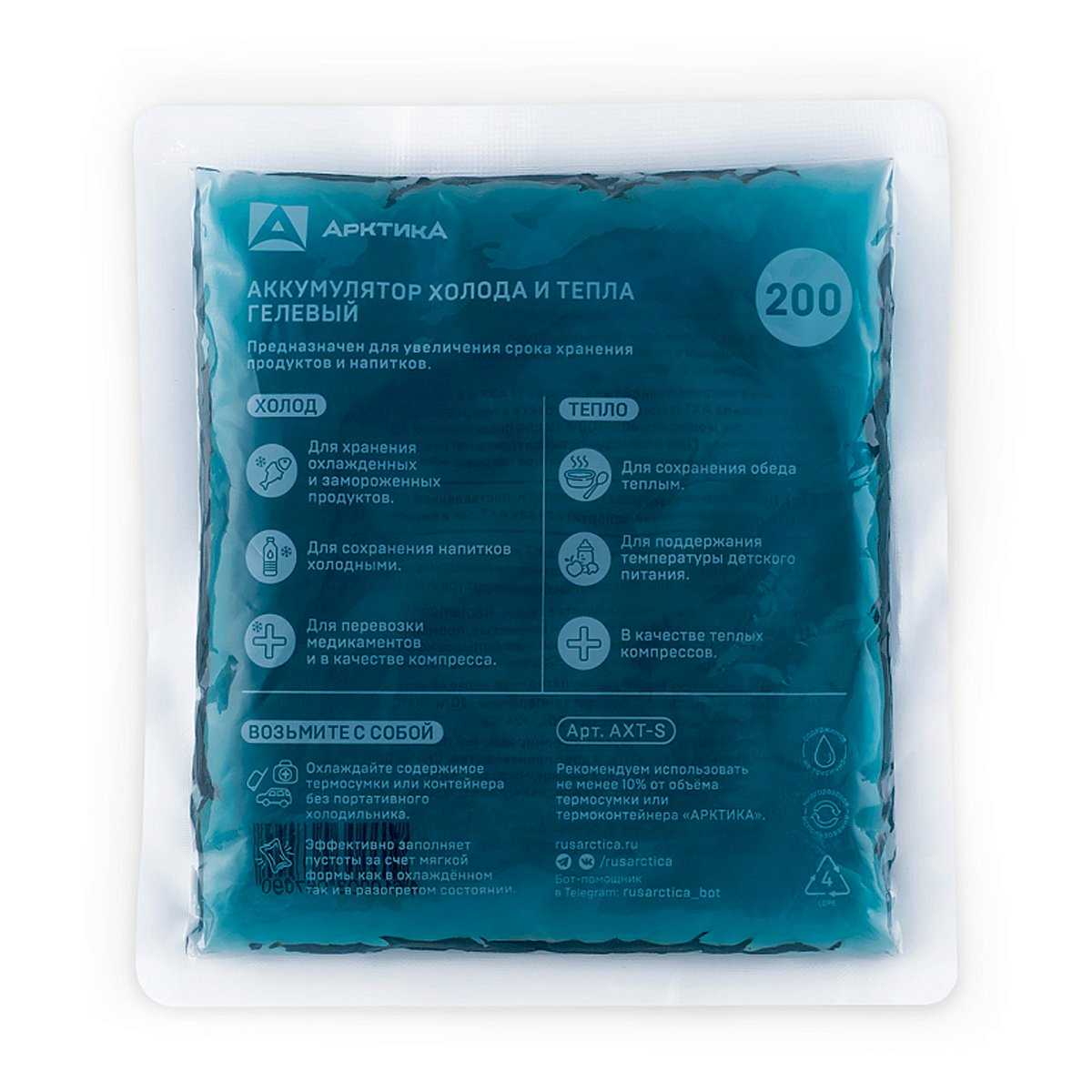 Мягкий аккумулятор холода и тепла – находка для термосумок небольших объемов. Легкий, не занимает много места, принимает нужную форму и эффективно занимает пространство внутри термосумки. Выручит при переноске ланча и обеда на работу, готовых блюд, свежих и скоропортящихся продуктов, медикаментов и деликатесов, которым нужен определенный температурный режим. Кроме того, может использоваться как холодный и теплый компресс.Гелевый состав аккумулирует температуру лучше солевого, способен удерживать тепло и не теряет гибкость при замерзании. После нагрева в горячей воде или СВЧ мягкий аккумулятор возьмет на себя удержание тепла до 4 часов, после охлаждения в морозилке – до 5 часов. Прост в использовании и полностью безопасен для здоровья.Рекомендуем всегда отталкиваться от размера вашей термосумки, чтобы расположить аккумуляторы сверху и снизу не менее 10% от ее объема. Например, к термосумке для ланча на 7,5 литров вам понадобятся аккумуляторы, объем которых в сумме составит не менее 700 мл