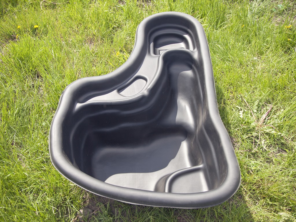 Пластиковая форма для пруда, изготовленная из полиэтилена низкого давления, отличается повышенной устойчивостью к колебаниям температуры и УФ-лучам. На отведенном участке ставят форму, отмечают колышками и шнуром контуры будущего водоема, прибавляя по 15–20 см с расчетом, чтобы удобнее было не только установить форму, но и сделать подсыпку. По всему периметру снимается плодородный слой, который в дальнейшем можно использовать в саду. Грунт выкапывается постепенно, сначала до глубины первой плоскости, затем после разметки таким же способом до самой последней плоскости.Объем: 150 л.Размер: 115 х 88 х 40 см.