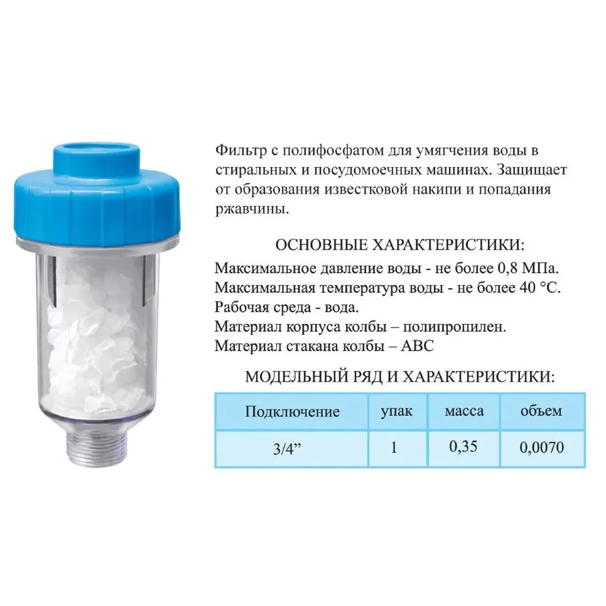 Вода проходя через загрузку фильтр дозатора, растворяет кристаллы полифосфата и насыщается определенным количеством полифосфата.В результате этого процесса образуется пленка, которая предотвращает образование накипи на нагревательных элементах стиральной машины. Не использовать для питьевой воды!!!Назначение: защищает нагревательный элемент, внутренние поверхности стиральной машины от накипи.Снижает расход стирального порошкаУменьшает расход электроэнергииУвеличивает эффективности стиркиХарактеристики:Масса полифосфата в фильтре 115 грамм +,- 5 %Ресурс загрузки до 30 000 литров (6 месяцев)Рабочая температура воды +2 +45Рабочее давление воды от 0,5 до 6 атмПодключение 3/4 дюйма