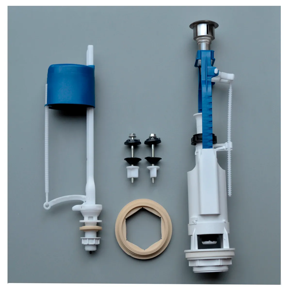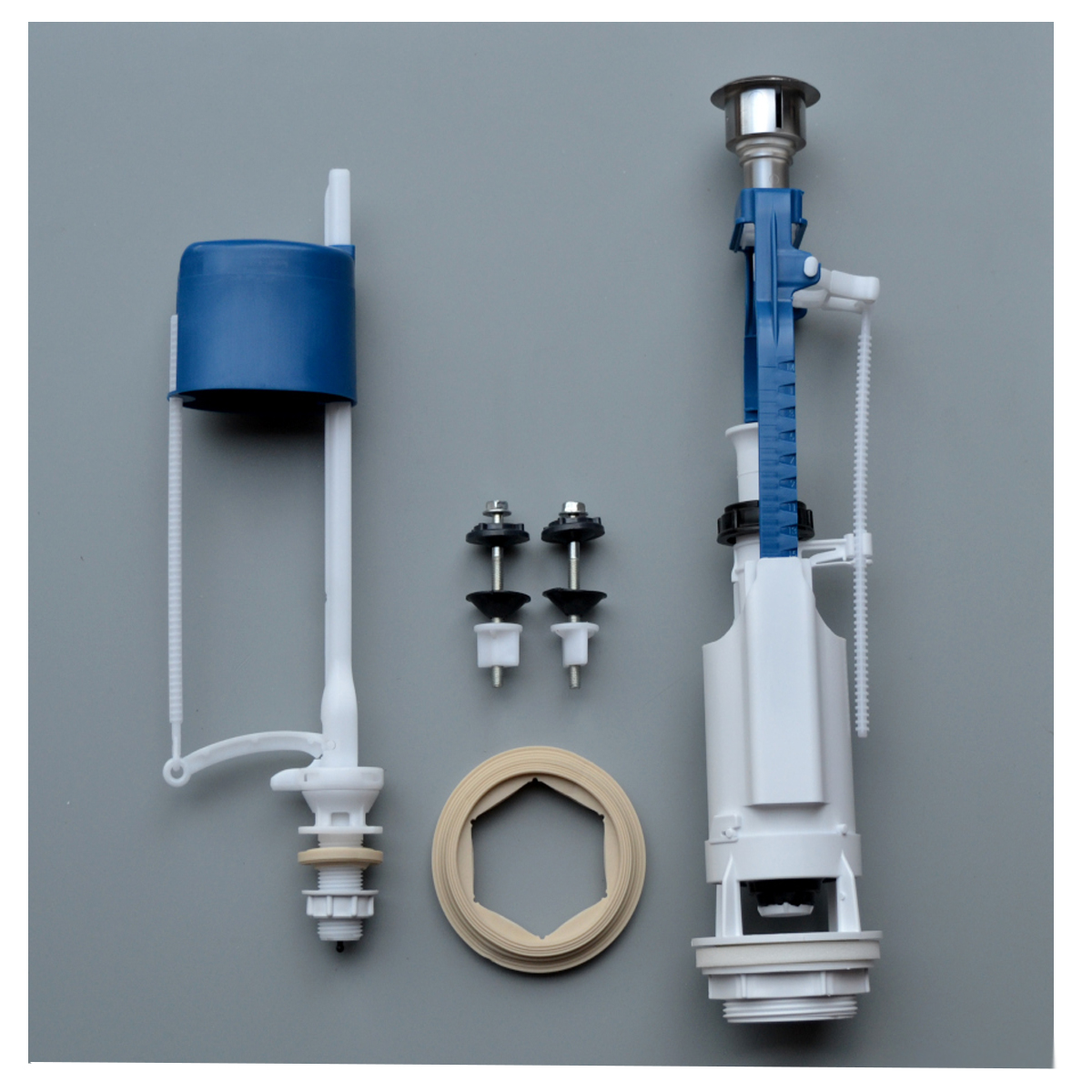 Однорежимная арматура для сливного бачка унитаза с нижней подводкой воды и отверстием в крышке бачка 38-44 мм, круглая хромированная сливная кнопка, подключение: пластиковый штуцер G1/2 НР.Комплект поставки:наливной механизм – 1 шт.;сливной механизм – 1 шт.;круглая смывная кнопка, цвет: хром – 1 шт.;гайка с уплотнительным кольцом для фиксации впускного штуцера – 1 шт.;комплект для крепления бачка к чаше унитаза – 1 шт.;прокладка для уплотнения стыка между бачком и чашей унитаза – 1 шт.;паспорт и инструкция по монтажу и эксплуатации – 1 шт.