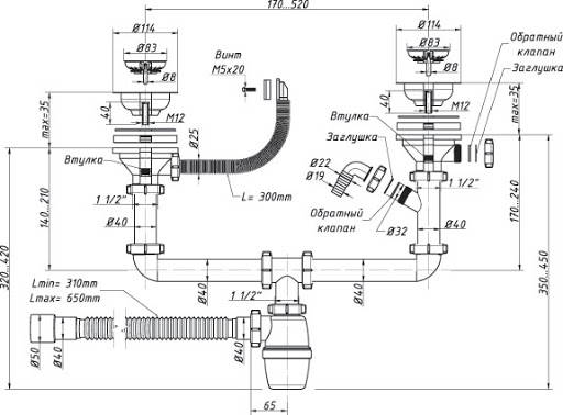 Сифон с большим корпусом и отстойником для двойной одноуровневой или двухуровневой мойки с прямоугольным переливом, с нержавеющей чашкой 114мм и отводом для слива от стиральной машины. В комплекте идёт отвод в канализацию гибкая труба 40-40/50 и две прокладки на перелив – прямоугольная на квадратную форму мойки и полукруглая на круглую.Характеристикиматериал сифона: полипропиленматериал решеток: нерж. стальдиаметр решеток, мм: 114 x (2 шт.)входное отверстие: 2 x 3-1/2"выходное отверстие, мм: 40регулировка по высоте вып.1, мм: 140–210регулировка по высоте вып.1, мм: 170–240регулировка по высоте сифона, мм: 350–450регулировка по ширине, мм: 170–520один отвод, мм: 19/22длина перелива, мм: 300прокладка плоская, мм: 63x40x7,5прокладка полукруглая, мм: 63x40x11гибкая труба, мм: 40–40/50длина гибкой трубы, мм: 310–650Комплектация:Стакан 40: 1Прокладка корпуса 40: 1Корпус 40: 1Прокладка коническая д.40мм: 6Гайка д.40мм: 8Тройник: 1Колено 90: 2Патрубок 40: 1Прокладка торцевая д.40мм: 2Горловина 90 с переливом: 2Прокладка 90 нижняя: 2Прокладка 90 верхняя: 2Комплект решетки D=114: 2Гайка д.25мм: 3Прокладка коническая д.25мм: 1Патрубок 40 с входом: 1Штуцер: 1Гофрошланг д.25мм (30 см) белый: 1Перелив мойки: 1Прокладка под перелив мойки прямая: 1Прокладка под перелив мойки круглая: 1Патрубок 40 с входом: 1Винт 5х20: 1Гибкая труба 40-40/50: 1Заглушка д.25мм: 1Прокладка д.25мм с гидрозатвором: 1