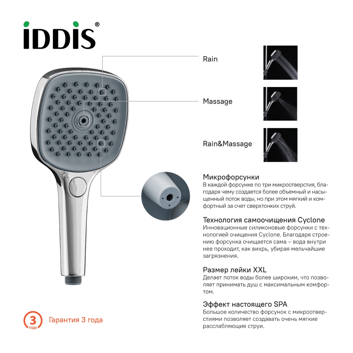 Стильное и инновационное решение для душевой зоны – лейка из коллекции Slide. Центральная форсунка этой модели работает в режиме точечного массажа: интенсивно и сильно. Благодаря своему строению и функции самоочищения Cyclone она легко пропускает водяной вихрь, убирающий даже мельчайшие загрязнения. Душевую лейку, оснащенную функцией Cyclone, не придется разбирать, чтобы почистить. Три микроотверстия в остальных форсунках лейки Slide позволяют добиться одновременно объемного и мягкого потока воды. Получите максимум удовольствия от эффекта настоящего СПА при любом режиме работы лейки.Поверхность диска лейки: ABS-пластикРасход воды (л./мин.): 9,4 / 7,8 / 13Размер изделия, мм.: 257х120х61