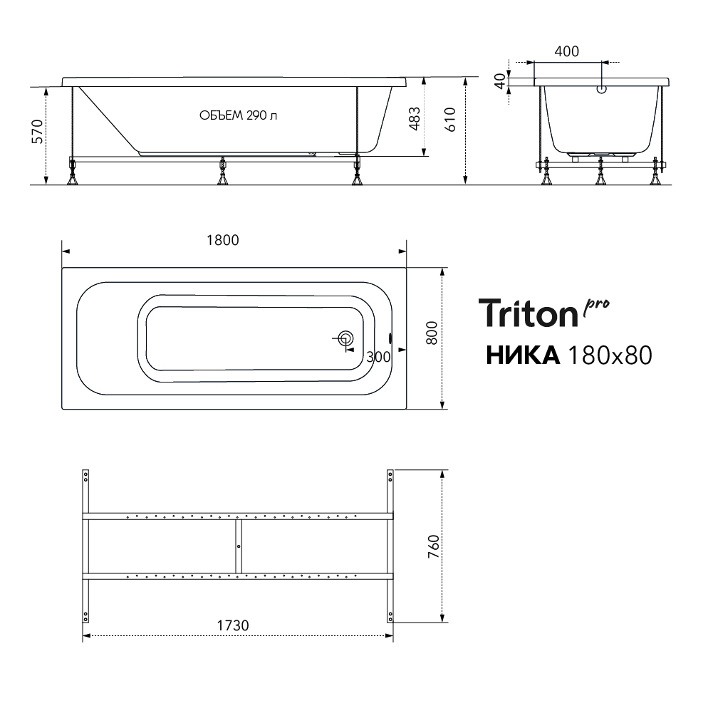 Акриловая ванна «Ника» размером 180×80 см предназначена для комфортного принятия водных процедур и отлично подходит для просторных ванных комнат.