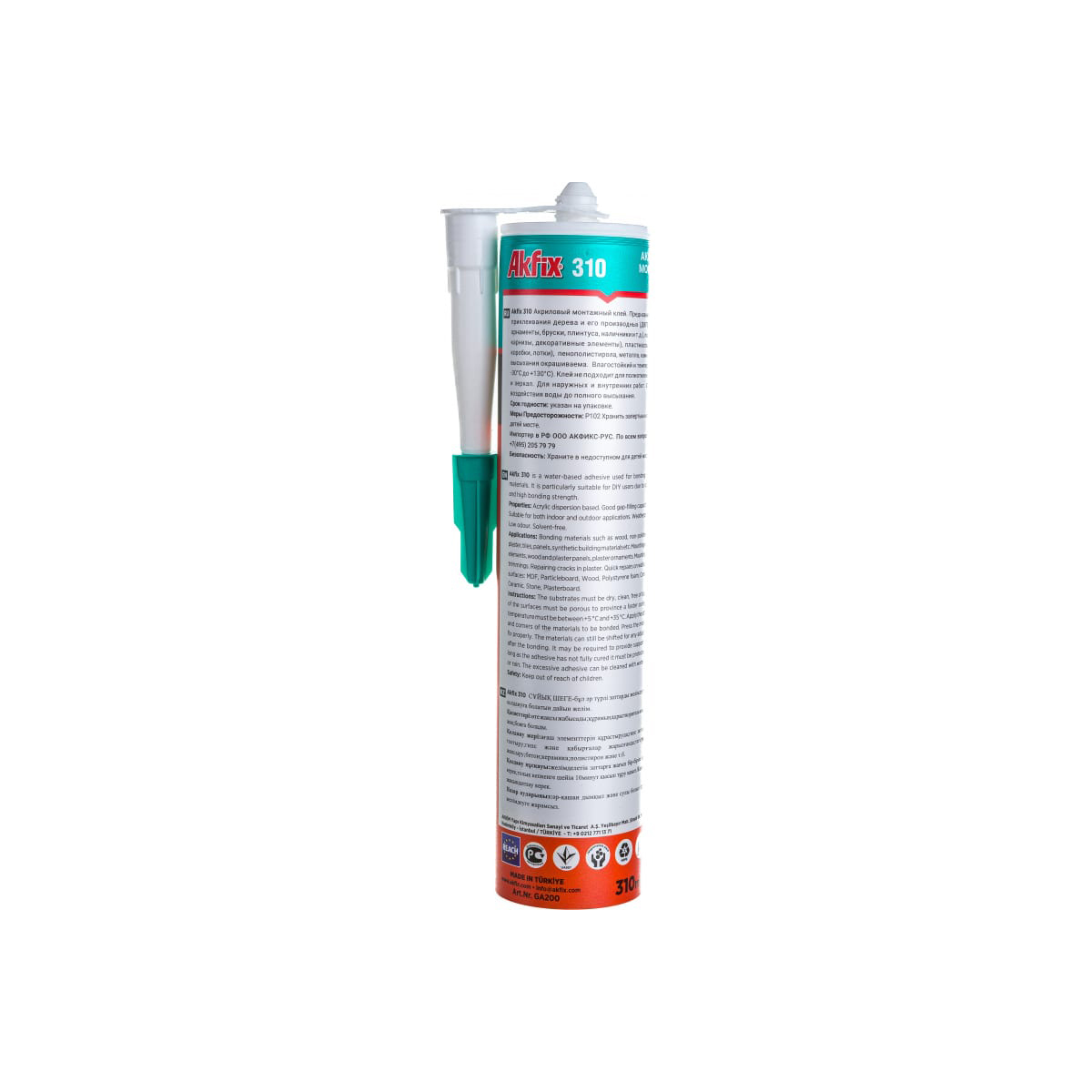 Однокомпонентный водостойкий клей на акриловой основе, не содержащий растворителей. Предназначен для прочного склеивания дерева и его производных (ДВП, багеты, лепные орнаменты,бруски, плинтуса, наличники и т.д.), полиуретана (балки, карнизы, декоративные элементы), пластмассы (панели из ПВХ, коробки, лотки), пенополистирола, металла, камня, кирпича. Экологически чистый продукт, не обладает запахом, окрашивается любыми видами красок. Подходит для непрофессионального использования. Устойчив к атмосферным воздействиям и ультрафиолетовому излучению. Не содержит растворители. Не воспламеняется. Образует ударопрочное соединение. Высокое качество при низких +5 и при высоких +40 температурах. Эластичен при низких -20 и высоких +80 температурах. Хорошая адгезия к большинству материалов без грунтовки. Для склеивания пористых и непористых поверхностей, а также пористых между собой. Легко наносится. Водоустойчив после отвердения. Легко очищается водой. Применим внутри и снаружи помещений.Технические характеристикиНазначение: монтажныйТип: реакционныйОснова клея: акрилКоличество компонентов: 1Условия отверждения: влажность воздухаКонсистенция: пастаОбъем: 0.31 лВес нетто: 0.48 кгЦвет: белыйПалитра: белыйСклеиваемые материалы: дерево, МДФ, ДСП, пенополистирол, бетон, кирпич, керамика, камень, гипсокартон, бетон, штукатурка, плитка, панели, синтетические строительные материалыВид тары: картриджАнаэробный: нетБез растворителей: даПрочность склеивания: 70 кг/см²Температура применения: от +5 до +35 °СВремя схватывания: 30-40 минВремя высыхания: 1-2 мм/24 чМасса вещества: 0 гМорозостойкий: нет