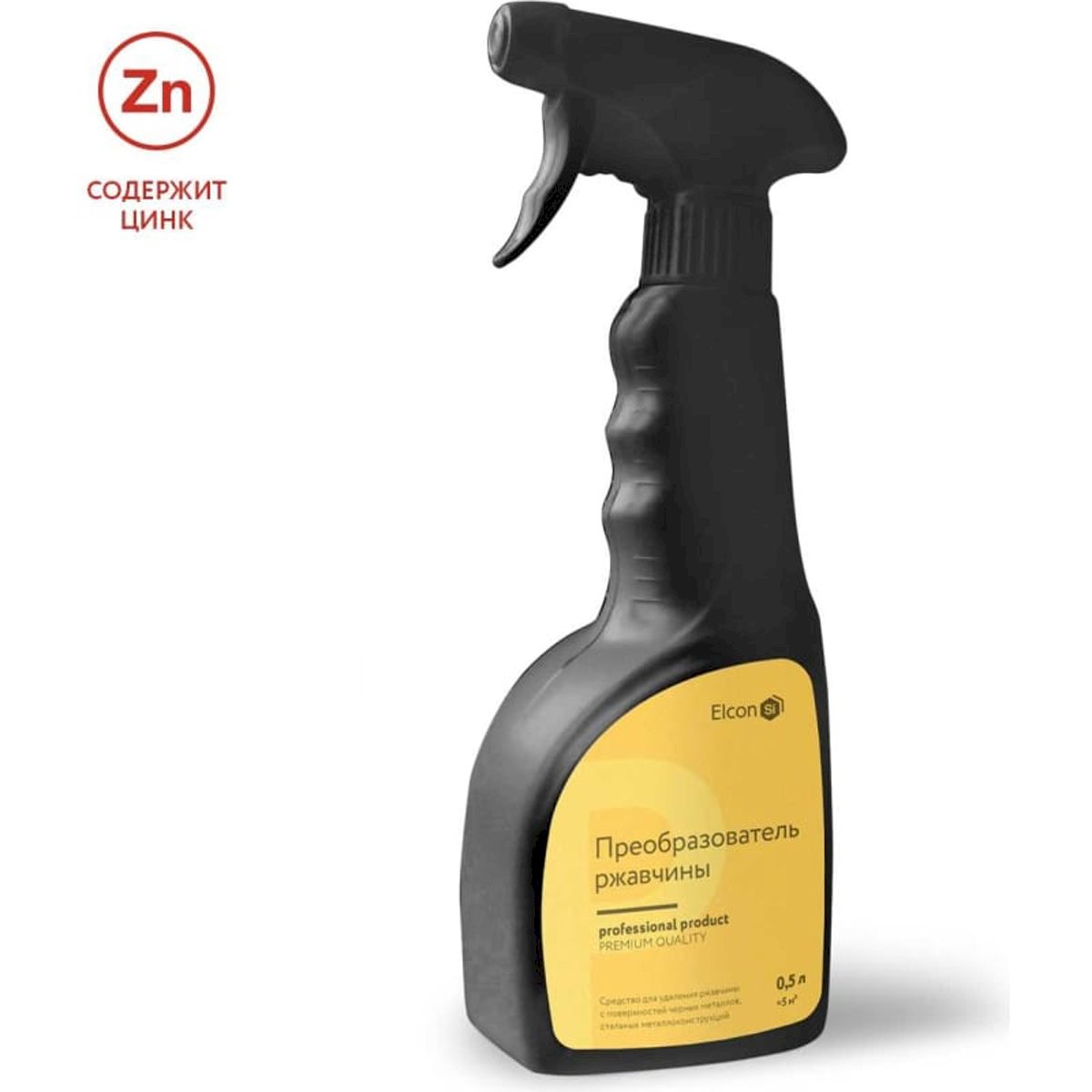 Elcon Преобразователь ржавчины P с цинком, удалитель ржавчины, 0,5 л триггер 00-00004030 предназначен для удаления ржавчины с поверхностей черных металлов, арматурных сталей, труб, паропроводов, водопроводов, различных металлоконструкций перед нанесением лакокрасочных покрытий.После применения средства на поверхности ржавого металла происходит химическая реакция, в результате которой образуется цинко-фосфатное покрытие. Средство может быть использовано для преобразования ржавчины толщиной до 100 мкм.Преобразователь ржавчины используется как при первичной окраске (для обработки окалины и сварных швов), так и по остаткам прочно держащейся ржавчины.Указания к применению :Обработку металлических конструкций преобразователем ржавчины Elcon P следует проводить при температуре окружающей среды от +5 °С до +35 °С.Поверхность, подлежащую обработке, необходимо очистить от загрязнений, лакокрасочных и иных покрытий.Очистить металлическую поверхность от рыхлой, отслаивающейся ржавчины металлической щеткой.Нанести средство Elcon P кистью, валиком или тампоном два раза с промежуточной сушкой до появления белого налета из преобразованной ржавчины.Время протекания реакции – до 30 минут.Выдержать до полного высыхания, смыть водой.Нанести финишный лакокрасочный материал в соответствии с инструкцией по применению не позднее 2-х суток с момента обработки.Области применения :Ржавые поверхностиТехнические характеристики :Вид: преобразователь ржавчиныОбъем: 0.5 лСостав: ортофосфорная кислота, функциональные добавкиРасход: 130 г/м2Уровень рН: 2.0-3.0Кислотный: естьС цинком: даВид тары: бутыль с распылителемВес нетто: 0.7 кгМарка: нетБез запаха: нетПреимущества :Образует защитное цинковое покрытиеПреобразует слой ржавчины толщиной до 100 микронПреобразует ржавчину до 100 мкмОбразует защитное цинковое покрытиеВремя протекания реакции – до 30 минутПоследующее нанесение ЛКМ без грунтованияНанесение от +5 °С до +35 °СРасход на 1 слой 100-130 г/м2