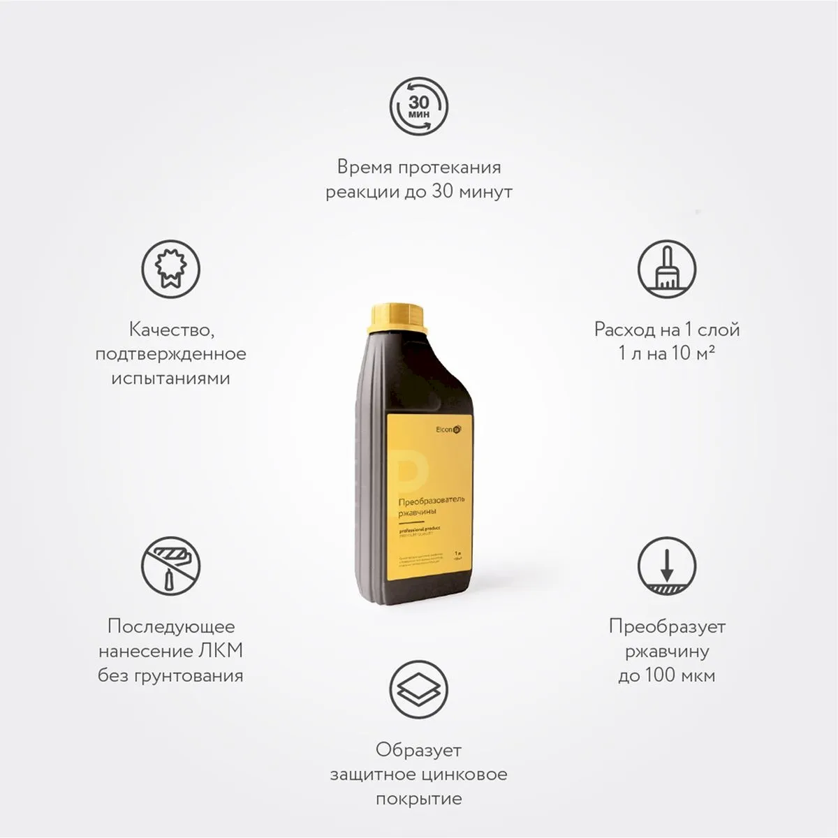 Преобразователь ржавчины Elcon P предназначен для удаления ржавчины с поверхностей черных металлов, арматурных сталей, труб, паропроводов, водопроводов, различных металлоконструкций перед нанесением лакокрасочных покрытий.После применения средства на поверхности ржавого металла происходит химическая реакция, в результате которой образуется цинко-фосфатное покрытие. Последующее нанесение ЛКМ на места, обработанные преобразователем, может производиться без дополнительного грунтования поверхности.Преобразователь ржавчины обеспечивает лакокрасочному покрытию отличную адгезию и противокоррозионную стойкость. Средство может быть использовано для преобразования ржавчины толщиной до 100 мкм.Elcon P используется как при первичной окраске (для обработки окалины и сварных швов), так и по остаткам прочно держащейся ржавчины. Средство широко применяется на объектах энергетического и нефтегазового комплекса, на судоремонтных и металлургических предприятиях.Свойства продукта :Преобразует ржавчину до 100 мкмОбразует защитное цинковое покрытиеВремя протекания реакции – до 30 минутПоследующее нанесение ЛКМ без грунтованияНанесение от +5 °С до +35 °С Расход на 1 слой 100-130 г/м2 Указания к применению :Обработку металлических конструкций преобразователем ржавчины Elcon P следует проводить при температуре окружающей среды от +5 °С до +35 °С. Поверхность, подлежащую обработке, необходимо очистить от загрязнений, лакокрасочных и иных покрытий. Очистить металлическую поверхность от рыхлой, отслаивающейся ржавчины металлической щеткой. Нанести средство Elcon P кистью, валиком или тампоном два раза с промежуточной сушкой до появления белого налета из преобразованной ржавчины. Время протекания реакции – до 30 минут. Выдержать до полного высыхания, смыть водой. Нанести финишный лакокрасочный материал в соответствии с инструкцией по применению не позднее 2-х суток с момента обработки. Области применения :Ржавые поверхности