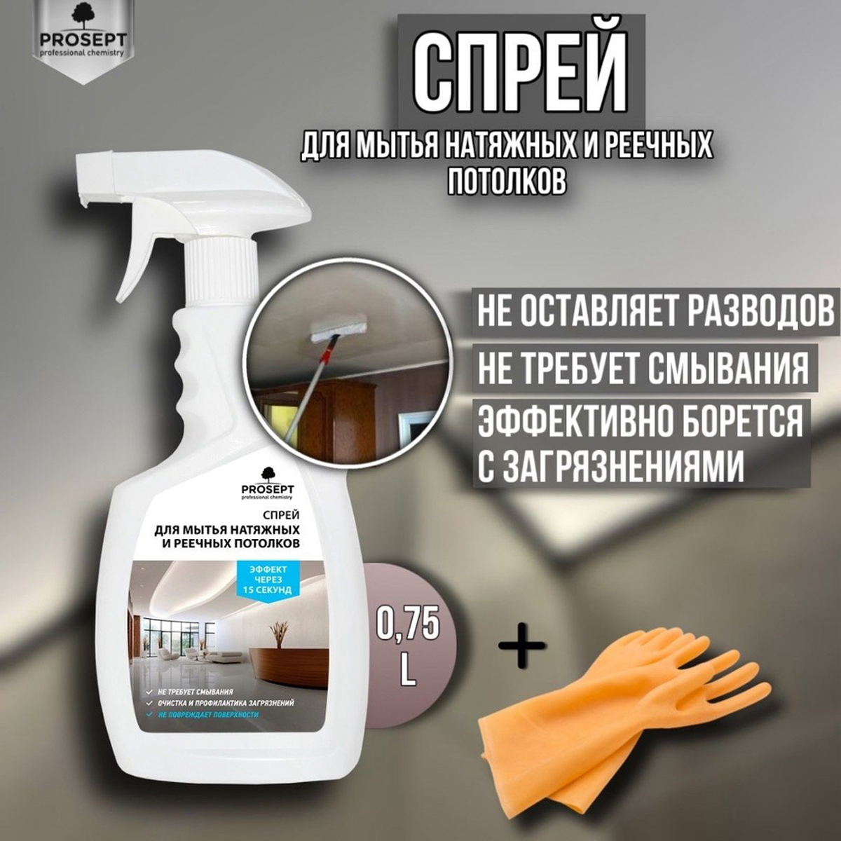 Universal Delicate - средство для очищения и предотвращения активного загрязнения натяжных и реечных потолков. Состав эффективно борется со следами жирового и мыльного налета, табака и насекомых, а также очищает от пыли, грязи и других бытовых загрязнений. Подходит для мытья натяжных ПВХ потолков с глянцевым, матовым и сатиновым полотном, покрытий с фотопечатью, а также реечных и подвесных потолков из алюминия, стали, дерева, ПВХ и других влагостойких поверхностей. Не требует смывания. Объем: 0,75 л