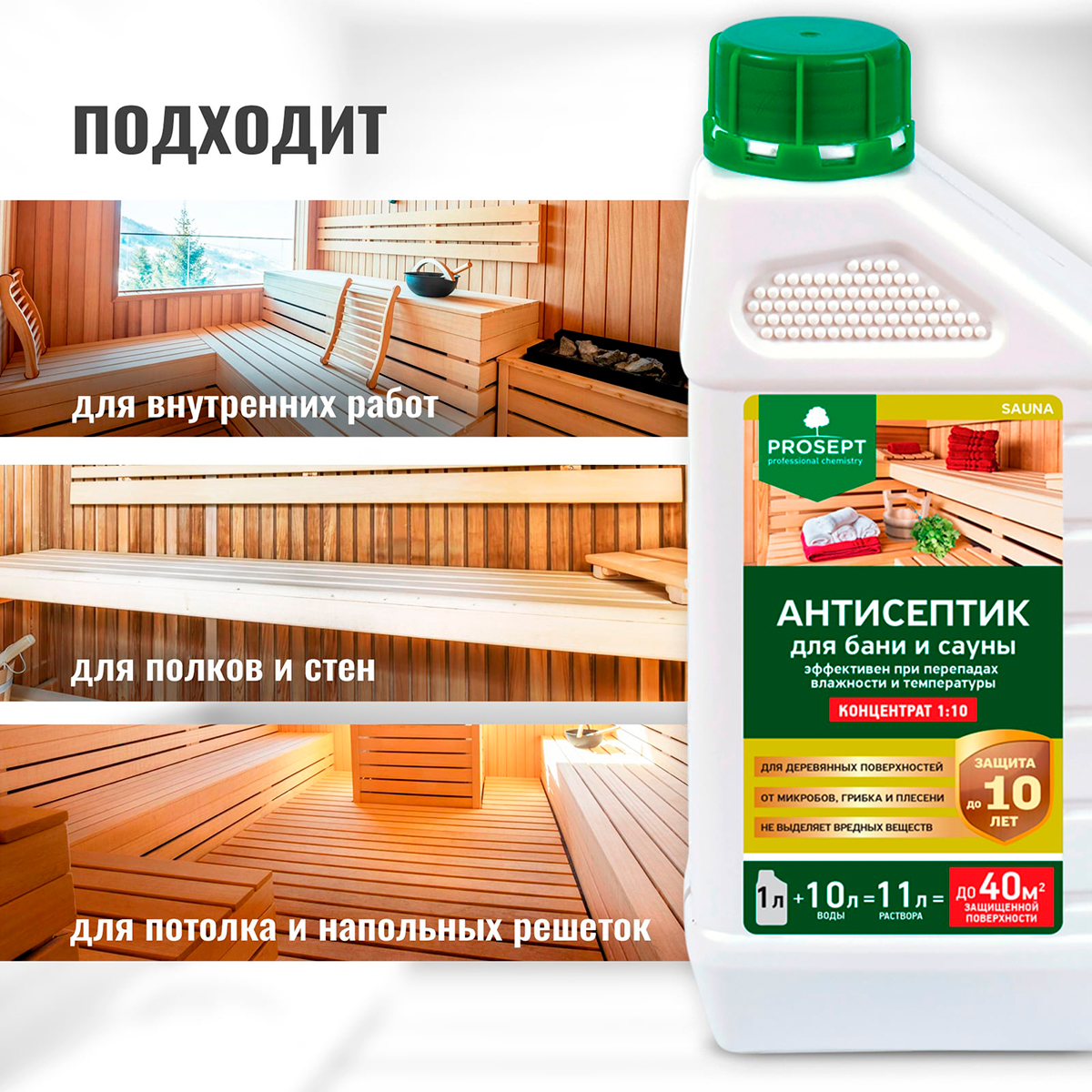PROSEPT SAUNA – антисептик на водной основе для бань и саун. Предназначен для защиты древесины от действия дереворазрушающих и деревоокрашивающих плесневых грибов в саунах, парных, моечных и прилегающих к ним помещениях. Предотвращает развитие болезнетворных микробов, спор грибков. Обеспечивает надежную защиту при циклическом увлажнении, конденсационном увлажнении и высоких перепадах температур.PROSEPT SAUNA подходит для обработки любой древесины в саунах, включая конструкционные элементы - полки, стены, потолок, напольные решетки и т. п.Антисептик способен как предотвращать биопоражение, так и останавливать уже начавшиеся процессы разрушения древесины биологическими агентами. Древесина, обработанная PROSEPT SAUNA, при необходимости легко пропитывается маслами для саун, окрашивается, тонируется и т. п. Особенность - не изменяет цвет, естественный аромат и структуру древесины. Соответствует новым Европейским стандартам обработки строительной древесины для Классов Использования 1, 2 и 3A.МЕХАНИЗМ ДЕЙСТВИЯ:PROSEPT SAUNA – это высокоэффективная композиция синтетических биоцидов нового поколения на водной основе. В составе используются вещества, применяемые для обеззараживания и дезинфекции в медицине и на пищевых производствах. Активные компоненты препарата хорошо проникают и связываются с клеточной тканью древесины, обеспечивая тем самым устойчивость к конденсационному увлажнению и быстрому вымыванию.Срок защиты во многом зависит от интенсивности эксплуатации. В помещениях, где отсутствует риск прямого действия влаги, гарантированный срок защиты может составить от 10 лет и более. В саунах, где используется "сухой пар", рекомендуется проводить профилактическую обработку каждые 3-5 лет. В парных и моечных профилактику следует проводить раз в 2-3 года.