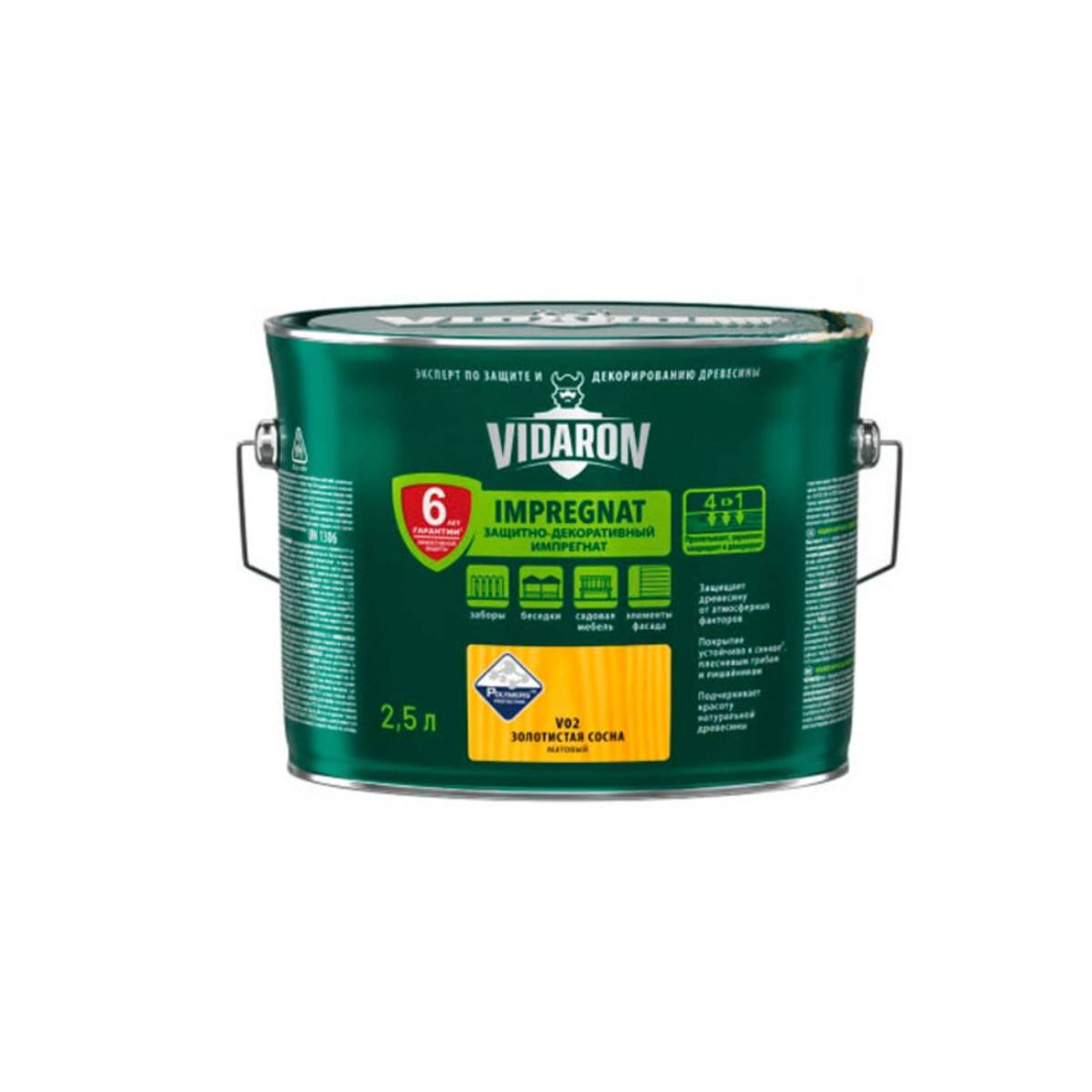 Декоративно-защитный импрегнат Vidaron – это современное изделие, предназначенное для защиты древесины и деревопроизводных материалов. Он создает на обработанных поверхностях элегантный матовый финишный слой, подчеркивающий естественный рисунок древесины. Импрегнат содержит Teflon surface protector, придающий ему дополнительные защитные свойства.Этот защитно-декоративный импрегнат предназначен для нанесения на ранее необработанные изделия из древесины и деревопроизводных материалов с целью их защиты от вредного воздействия биологических факторов, влаги и атмосферных условий. Он является обязательным слоем грунтовки в бесцветной версии, который биологически защищает древесину перед последующим нанесением цветного импрегната, лакобейса, наружного лака и других средств.Использование: наружные и внутренние работы.Тип поверхности: ДВП, ДСП, OSB, дерево.Степень блеска: матовый.Объем, л : 2,5.
