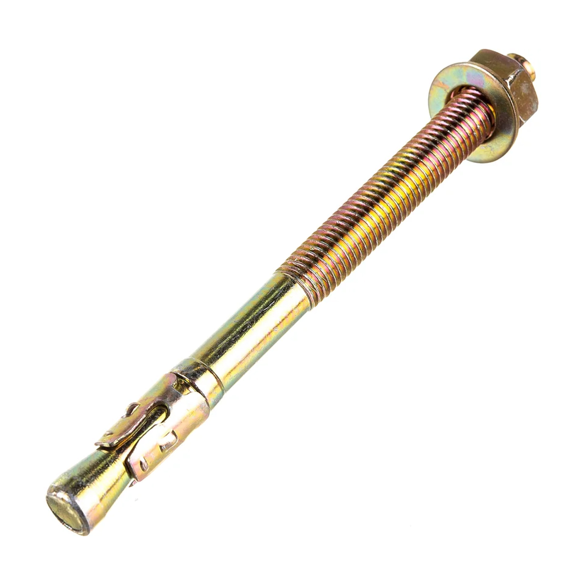 Анкер клиновой, согласно положениям соответствующего ГОСТа, – это шпилька, рабочая часть которой выполнена в форме конуса. Благодаря особенностям своей конструкции и принципу работы такой анкер способен обеспечить надежное крепление конструкций, обладающих большими размерами и значительным весом. Анкер клиновой. Область примененияТакой эффективный крепежный элемент, как анкер клиновой, одинаково успешно используется как в капитальном строительстве, так и при выполнении домашних ремонтных работ. Анкер-клин применим в тех ситуациях, когда на поверхности стен, пола и потолка, выполненных из прочных материалов (бетон, кирпич и др.), необходимо надежно закрепить предметы, обладающие большими размерами и значительной массой.Учитывая тот факт, что такие анкеры часто применяют для выполнения монтажа лифтовых шахт, кабельных трасс, высоконагруженных элементов лестничных конструкций, к их надежности и долговечности предъявляются очень высокие требования. Крайне важно также при использовании этих крепежей строго соблюдать правила их монтажа.Среди разновидностей таких крепежных элементов отдельное место занимает анкер-клин потолочный. Его используют для того, чтобы надежно фиксировать на поверхности потолка тяжелые и габаритные люстры.Клиновой анкер STARFIX М12x150 мм SMP-55995-1 используется для крепления тяжеловесных конструкций, кабельных трасс, несущих консолей, перильных ограждений методом сквозного монтажа к полнотелому бетону, природному строительному камню, полнотелому кирпичу.Технические характеристики :Диаметр резьбы: М12Диаметр установки: 12 ммДлина анкера: 150 ммМатериал: стальПокрытие: желтопассивированный