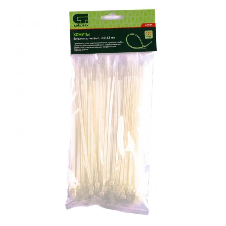 —Хомуты СИБРТЕХ 180 х 3,6 мм, пластмассовые, белые, 100 шт.