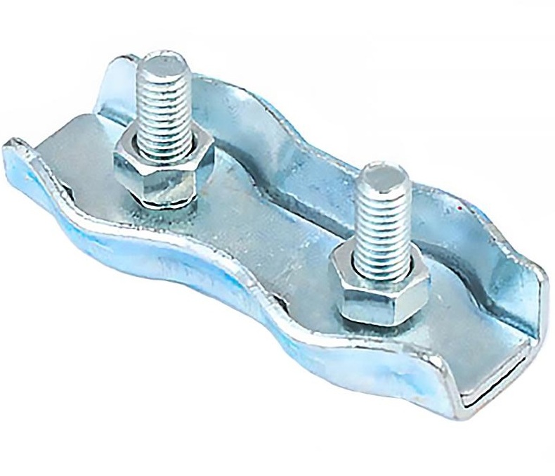 Применение: для изготовления разъемного соединения тросов между собой, а также для изготовления петель на их концах. Используется в быту, строительстве, судостроении, машиностроении, при погрузочно-разгрузочных работах.Материал изготовления: сталь.Покрытие: белый цинк.Монтаж: свободный конец троса или каната закладывается между двумя болтами в форму, соответствующую форме основания зажима. Трос или канат зажимается надевающейся на болты накладкой; две пластины равномерно сжимаются при помощи гаек, образуя соединение.