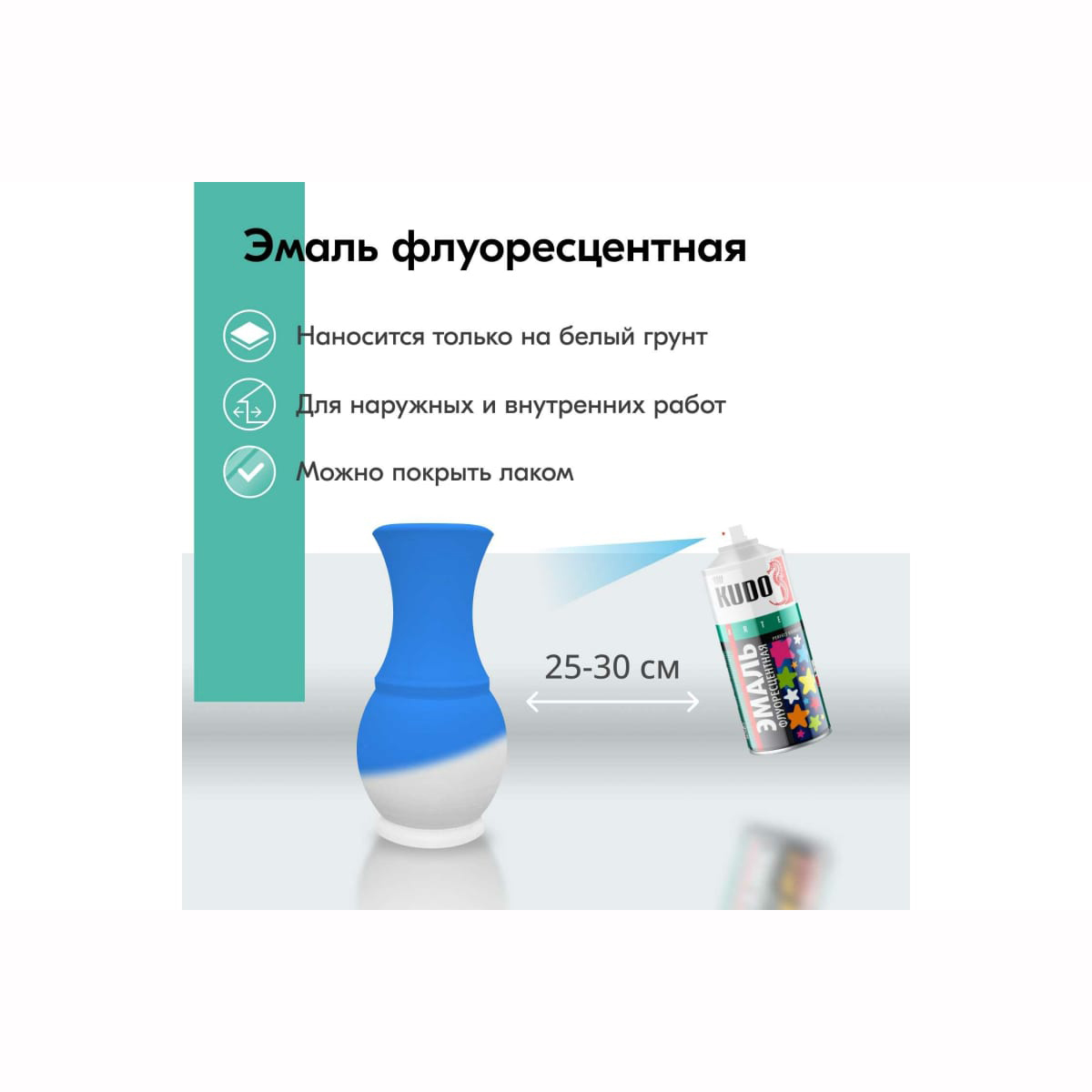 Специальная эмаль со светоотражающей способностью для создания предупредительных и сигнальных эффектов на дорожных знаках и технике, станках, ступенях, элементах ограждений, а также для оформительских работ и декоративного окрашивания.При ультрафиолетовом облучении интенсивность свечения эмали увеличивается.Во избежание попадания следов аэрозоля рекомендуется защищать поверхности, не подлежащие окраске.Для достижения наилучших результатов эмаль наносить при температуре окружающей среды не ниже +10°С.Перед использованием баллон энергично встряхивать в течение 2–3-х минут.Эмаль наносится на предварительно обезжиренную, зачищенную, загрунтованную и зашлифованную поверхность. Для грунтования поверхности рекомендуется использовать "Грунт акриловый универсальный KUDO®".Эмаль наносится с расстояния 25–30 см в 2–3 слоя с промежуточной сушкой 10–15 минут при температуре +20°С. Время высыхания при температуре +20°С не менее 30 минут.Для придания большей устойчивости к воздействию внешних факторов желательно окрашенную поверхность покрыть лаком. Рекомендуется использовать "Лак акриловый универсальный KUDO®".Основа: акриловаяСушка между слоями: 10-15 минутВысыхание на отлип: 30 минутПолное высыхание: 2 часаРасход: ~ 2 м²Состав: модифицированная полиакрилатная смола, флуоресцентные пигменты, функциональные добавки, ксилол, бутанол, метилацетат, пропан, бутан.Важно! Эмаль наносится только на белый грунт. В противном случае флуоресцентный эффект не проявится в полной мере.Внимание! По окончании работы во избежание засорения головки распылителя перевернуть баллон вверх дном и распылять до тех пор, пока не перестанет поступать эмаль.