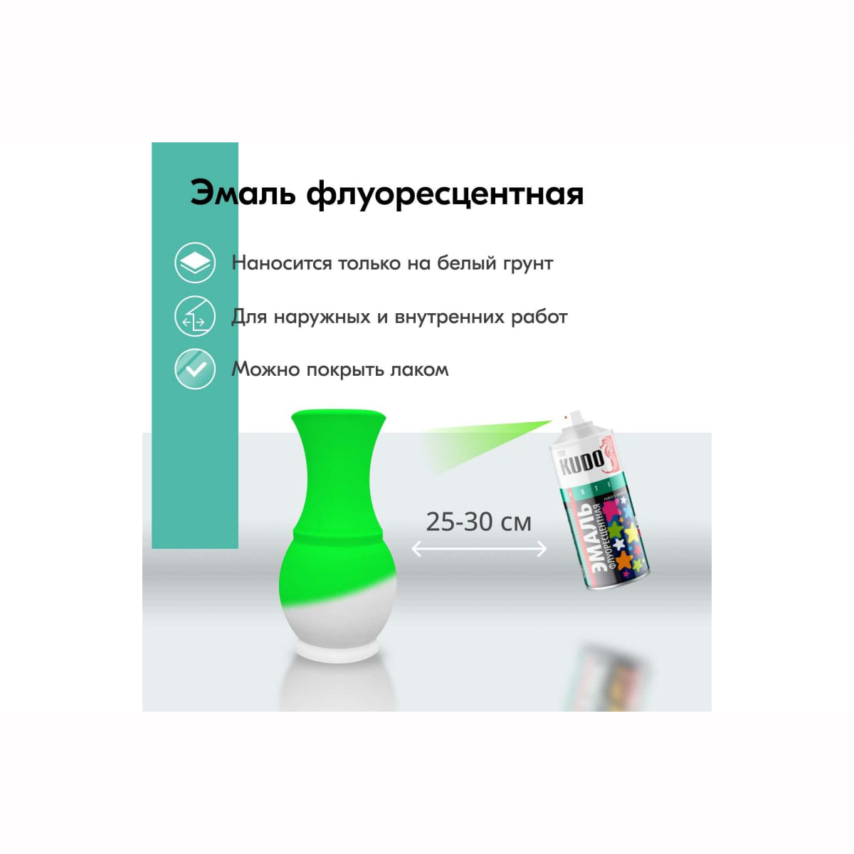 Специальная эмаль со светоотражающей способностью для создания предупредительных и сигнальных эффектов на дорожных знаках и технике, станках, ступенях, элементах ограждений, а также для оформительских работ и декоративного окрашивания.При ультрафиолетовом облучении интенсивность свечения эмали увеличивается.Во избежание попадания следов аэрозоля рекомендуется защищать поверхности, не подлежащие окраске.Для достижения наилучших результатов эмаль наносить при температуре окружающей среды не ниже +10°С.Перед использованием баллон энергично встряхивать в течение 2–3-х минут.Эмаль наносится на предварительно обезжиренную, зачищенную, загрунтованную и зашлифованную поверхность. Для грунтования поверхности рекомендуется использовать "Грунт акриловый универсальный KUDO®".Эмаль наносится с расстояния 25–30 см в 2–3 слоя с промежуточной сушкой 10–15 минут при температуре +20°С. Время высыхания при температуре +20°С не менее 30 минут.Для придания большей устойчивости к воздействию внешних факторов желательно окрашенную поверхность покрыть лаком. Рекомендуется использовать "Лак акриловый универсальный KUDO®".Основа: акриловаяСушка между слоями: 10-15 минутВысыхание на отлип: 30 минутПолное высыхание: 2 часаРасход: ~ 2 м²Состав: модифицированная полиакрилатная смола, флуоресцентные пигменты, функциональные добавки, ксилол, бутанол, метилацетат, пропан, бутан.Важно! Эмаль наносится только на белый грунт. В противном случае флуоресцентный эффект не проявится в полной мере.Внимание! По окончании работы во избежание засорения головки распылителя перевернуть баллон вверх дном и распылять до тех пор, пока не перестанет поступать эмаль.