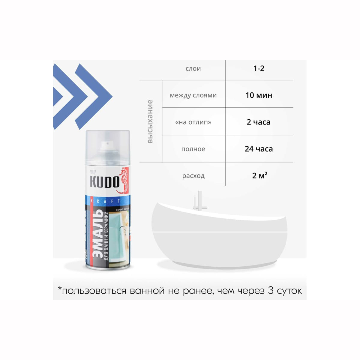 Эмаль для ванн KUDO белая KU-1301 используется для косметического ремонтного окрашивания эмалированных ванн и керамической плитки. Благодаря аэрозольному распылению продукт легко наносится на труднодоступные места. Состав на основе синтетической смолы обладает высокими адгезивными свойствами к окрашиваемой поверхности.Высококачественная эмаль предназначена для косметической ремонтной окраски эмалированных ванн и керамики. Обеспечивает создание гладкого и прочного покрытия. Позволяет значительно продлить срок эксплуатации старой ванны. Легко наносится на труднодоступные места, имеет хорошую укрывистость, водостойкость, превосходную адгезию к окрашиваемой поверхности.Основа: синтетические смолыСушка между слоями: 10-15 минутВысыхание на отлип: 2 часаПолное высыхание: 24 часаПоверхности для нанесения: металл, окрашенная поверхность, камень, силикатная эмаль, керамикаРасход: ~ 2 м²Состав: модифицированная алкидная смола, пигменты, наполнители, функциональные добавки, ксилол, метилацетат, бутанол, пропан, бутанПрименениеВо избежание попадания следов аэрозоля рекомендуется защищать поверхности, не подлежащие окраске.Для достижения наилучших результатов эмаль наносить при температуре окружающей среды не ниже +10°С.Перед использованием баллон энергично встряхивать в течение 2–3-х минут.Эмаль наносится на предварительно обезжиренную, зачищенную, зашлифованную сухую поверхность. Для обезжиривания поверхности рекомендуется использовать "Удалитель силикона KUDO®".Эмаль наносится с расстояния 25–30 см в 2–3 слоя с промежуточной сушкой 10–15 минут при температуре +20°С. Время полного высыхания при температуре +20°С – 24 часа. Эксплуатация отреставрированной ванны допускается не ранее, чем через 72 часа после нанесения покрытия.Внимание! По окончании работы во избежание засорения головки распылителя перевернуть баллон вверх дном и распылять до тех пор, пока не перестанет поступать эмаль.