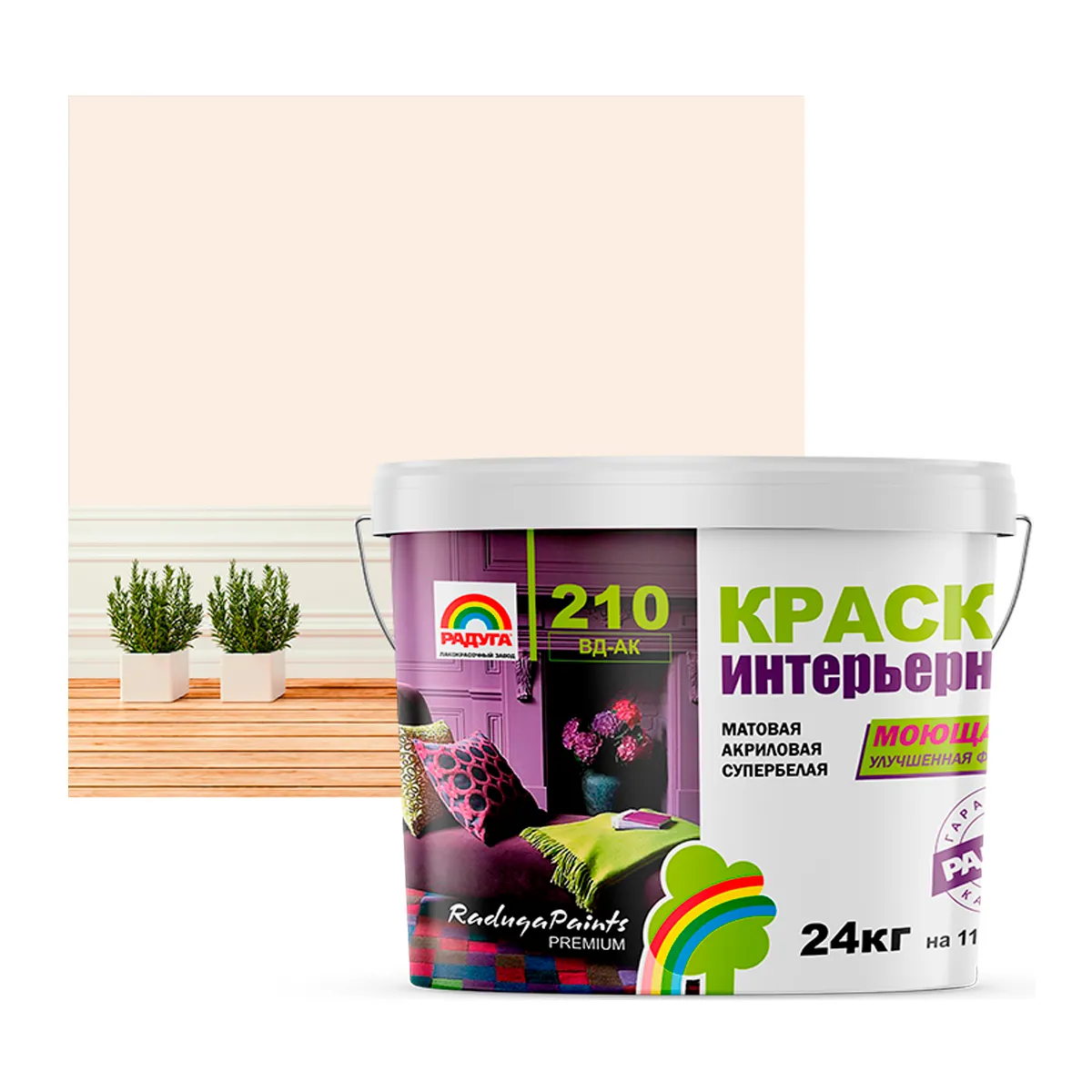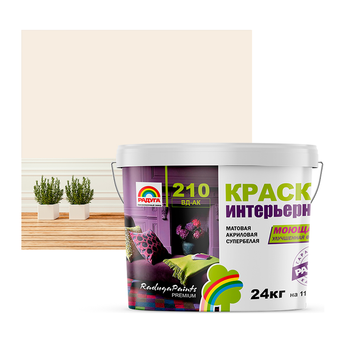 Для ценителей демократичных и качественных материалов, "Радуга-210" – верное решение. Широкий спектр цветов, превышающий 10.000 оттенков создаст внутри помещения исключительный шедевр. Это кладезь дизайнера и инициативы в декоративных решениях хозяина дома. Безвредна для здоровья и образует моющееся покрытие.Преимущества:Образует прочное, паропроницаемое (дышащее), матовое покрытие, без запаха, не токсична, пожаровзрывобезопасна, безвредна для здоровья и окружающей среды, отличная адгезия (сцепление) к штукатурке, шпатлевке, бетону, гипсоволокну, гипсокартону, оргалиту, ДСП, ДВП, МДФ, проста в применении, хорошая стойкость к истиранию, выдерживает влажную уборку, колеруется водоразбавимыми пигментными пастами.Назначение:Рекомендуется для окрашивания предварительно подготовленных поверхностей стен и потолков внутри помещений.Применение:Наносить на сухие и тщательно очищенные от старого основания поверхности, предварительно прогрунтованные укрепляющей “Primer Радуга-27" или стабилизирующей “Primer Радуга-28" грунтовками. Перед применением краску тщательно перемешать. При надобности разбавить водой не более 10%. Время нанесения последующего слоя через 1-2 часа. Наносить кистью, валиком, распылителем при температуре поверхности и окружающей среды не ниже +10⁰С.Меры предосторожности:Во время проведения работ и после их окончания, проветривать помещение. При попадании в глаза промыть большим количеством воды. Хранить в плотно закрытой таре. Беречь от детей.Расход: 200-250 гр/м² на 2 слоя.Высыхание: не более 1 часа при t+20°С и влажности 65%.Состав: вода, диоксид титана, наполнители, стирол-акриловая дисперсия, специальные добавки.Хранение: хранить и транспортировать в плотно закрытой таре при температуре не ниже +5⁰С.Вес: 7 кг.