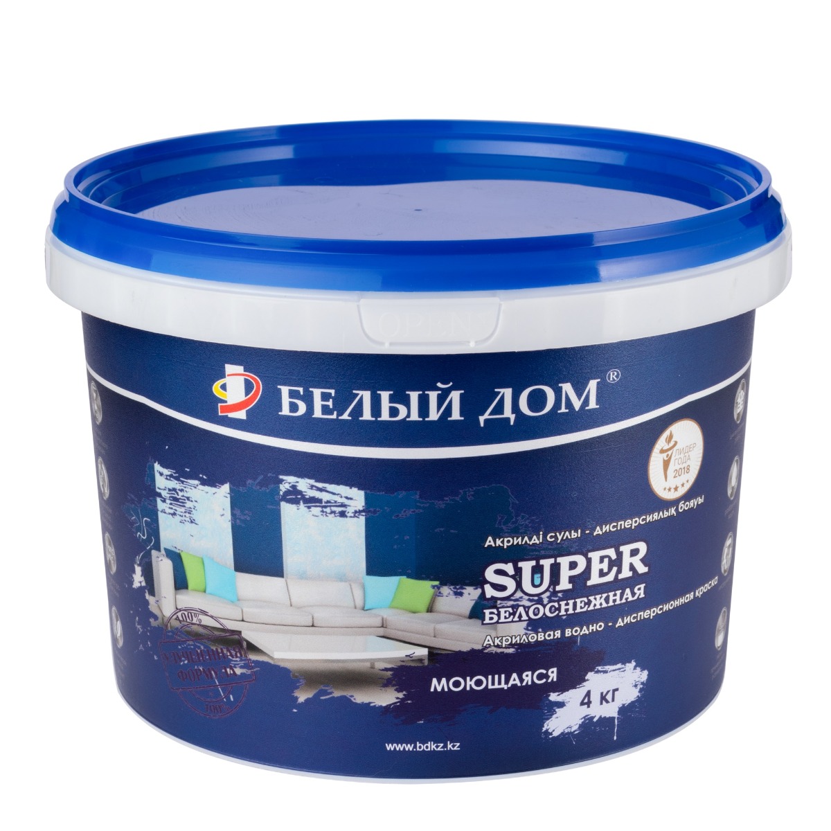 SUPER - водно-дисперсионная моющаяся акриловая краска матовая для внутренних работ.Назначение: для создания высококачественных покрытий внутри помещений с высокой эксплуатационной нагрузкой. Образует прочное паропроницаемое покрытие. Обладает отличной адгезией ко всем видам поверхностей, проста в применении, выдерживает влажную уборку.Состав: вода, карбонат кальция, диоксид титана, полимерное связующее, функциональные добавки.Свойства:высокая степень белизны;отличная укрываемость в один слой;водоэмульсия стойкая к мокрому истиранию (выдерживает влажную чистку);акриловая краска образует прочное паропроницаемое покрытие;не содержит органических растворителей, безопасна для человека и окружающей среды;легко колеруется (База А, В).Способ применения:Наносить на тщательно очищенную от грязи, пыли и старого непрочного основания поверхность, предварительно обработанную грунтовкой высокого проникновения "Белый Дом". Перед применением краску тщательно перемешать, при необходимости разбавить водой (до 10%). Наносить на подготовленную поверхность кистью, валиком, краскораспылителем в один или два слоя с промежуточной сушкой 2 часа при температуре не ниже +5ºС. Допускается колеровка краски универсальными концентратами для тонирования, а также другими колорантами для водных сред (База А, Б). После окончания работ инструмент, тару отмыть теплой водой.Расход: 120-200 г/м² на один слой (в зависимости от впитываемости поверхности).Время высыхания: при 20ºС и влажности не более 80% время высыхания на отлип 1 час, для второго слоя 2 часа, полное высыхание 24 часа.Условия хранения: в плотно закрытой таре при температуре не ниже +5ºС и не выше +35ºС.Инструменты для нанесения: валик, кисть, пистолет-распылитель.