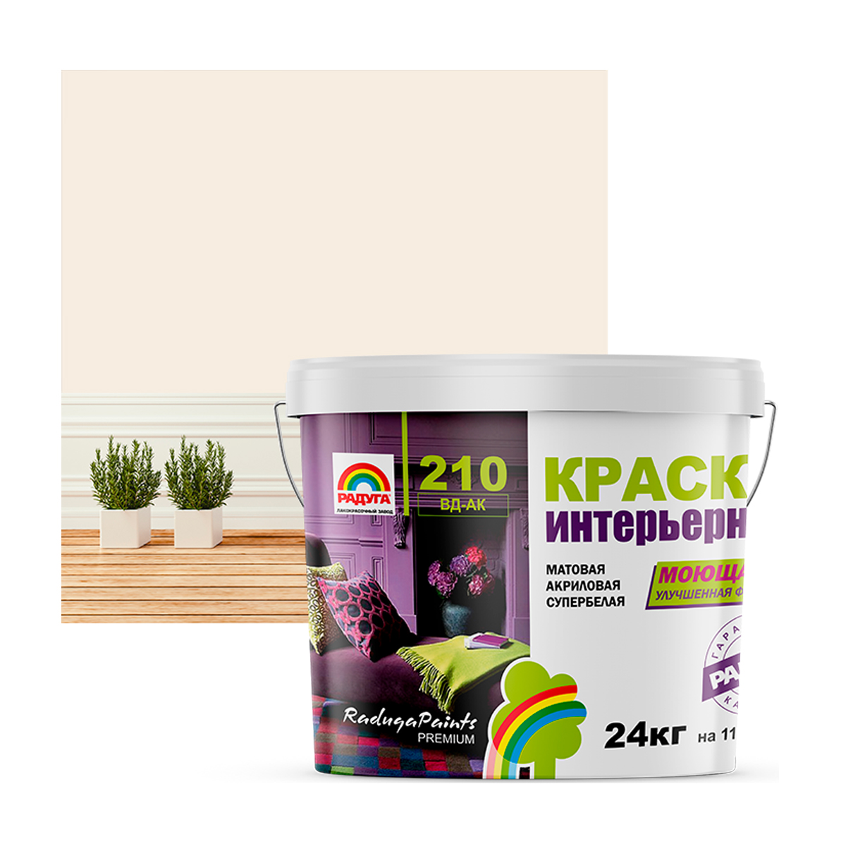 Для ценителей демократичных и качественных материалов, "Радуга-210" – верное решение. Широкий спектр цветов, превышающий 10.000 оттенков создаст внутри помещения исключительный шедевр. Это кладезь дизайнера и инициативы в декоративных решениях хозяина дома. Безвредна для здоровья и образует моющееся покрытие.Преимущества:Образует прочное, паропроницаемое (дышащее), матовое покрытие, без запаха, не токсична, пожаровзрывобезопасна, безвредна для здоровья и окружающей среды, отличная адгезия (сцепление) к штукатурке, шпатлевке, бетону, гипсоволокну, гипсокартону, оргалиту, ДСП, ДВП, МДФ, проста в применении, хорошая стойкость к истиранию, выдерживает влажную уборку, колеруется водоразбавимыми пигментными пастами.Назначение:Рекомендуется для окрашивания предварительно подготовленных поверхностей стен и потолков внутри помещений.Применение:Наносить на сухие и тщательно очищенные от старого основания поверхности, предварительно прогрунтованные укрепляющей “Primer Радуга-27" или стабилизирующей “Primer Радуга-28" грунтовками. Перед применением краску тщательно перемешать. При надобности разбавить водой не более 10%. Время нанесения последующего слоя через 1-2 часа. Наносить кистью, валиком, распылителем при температуре поверхности и окружающей среды не ниже +10⁰С.Меры предосторожности:Во время проведения работ и после их окончания, проветривать помещение. При попадании в глаза промыть большим количеством воды. Хранить в плотно закрытой таре. Беречь от детей.Расход: 200-250 гр/м² на 2 слоя.Высыхание: Не более 1 часа при t+20°С и влажности 65%.Состав: Вода, диоксид титана, наполнители, стирол-акриловая дисперсия, специальные добавки.Гарантийный срок: 12 месяцев от даты изготовления.Хранение: Хранить и транспортировать в плотно закрытой таре при температуре не ниже +5⁰С.Вес: 14 кг.