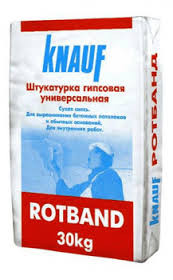 Ротбанд - универсальная сухая штукатурная смесь на основе гипсового вяжущего с добавками, обеспечивающими повышенную адгезию.Она предназначена для оштукатуривания вручную стен и потолков с любым типом поверхности (бетон, кирпич, пенополистирол, ДСП и т.п.) внутри помещений с нормальной влажностью, включая кухни и ванные комнаты в жилых помещениях.Штукатурные работы с КНАУФ-Ротбанд:Подготовка поверхности:Поверхность основания должна быть сухой, прочной, очищенной от пыли, загрязнений, отслаивающихся элементов, с бетонных поверхностей при необходимости удалить опалубочную смазку. Температура основания под штукатурку и помещения не должна быть ниже +5°С.Штукатурка Кнауф Ротбанд гипсовая универсальная (Knauf Rotband), 30кгГигроскопичные (сильно впитывающие влагу) основания обработать грунтовкой.Расход: расход сухой смеси составляет около 8,5 кг/м.кв.; при толщине наносимого слоя 10 мм. Из 30 кг (мешок) сухой смеси получается около 36 л готового раствора.Преимущества КНАУФ-Ротбанд!-Штукатурка гипсовая КНАУФ-Ротбанд обеспечивает гладкую поверхность, которая не нуждается в дополнительном шпаклевании.-Ротбанд не трескается даже при толстом слое.-Расход гипсовой штукатурки КНАУФ-Ротбанд в 2 раза меньше традиционных цементно-песчаных штукатурных смесей.-Нанесение за один намет штукатурного слоя толщиной до 50 мм без предварительного обрызга. При необходимости возможно нанесение более толстых слоев за два раза.-Универсальность материала - одновременное оштукатуривание и шпаклевание, изготовление декоративных элементов, ремонтные и реставрационные работы.-Высокая водоудерживающая способность - растворная смесь не расслаивается и не обезвоживается даже на пористых, хорошо впитывающих влагу основаниях и при повышенной температуре.-Регулирует влажностный режим в помещении - "дышит", создавая благоприятный микроклимат в помещении.Материал изготовлен из экологически чистого природного минерала (гипса) и не содержит вредных для здоровья человека веществ.
