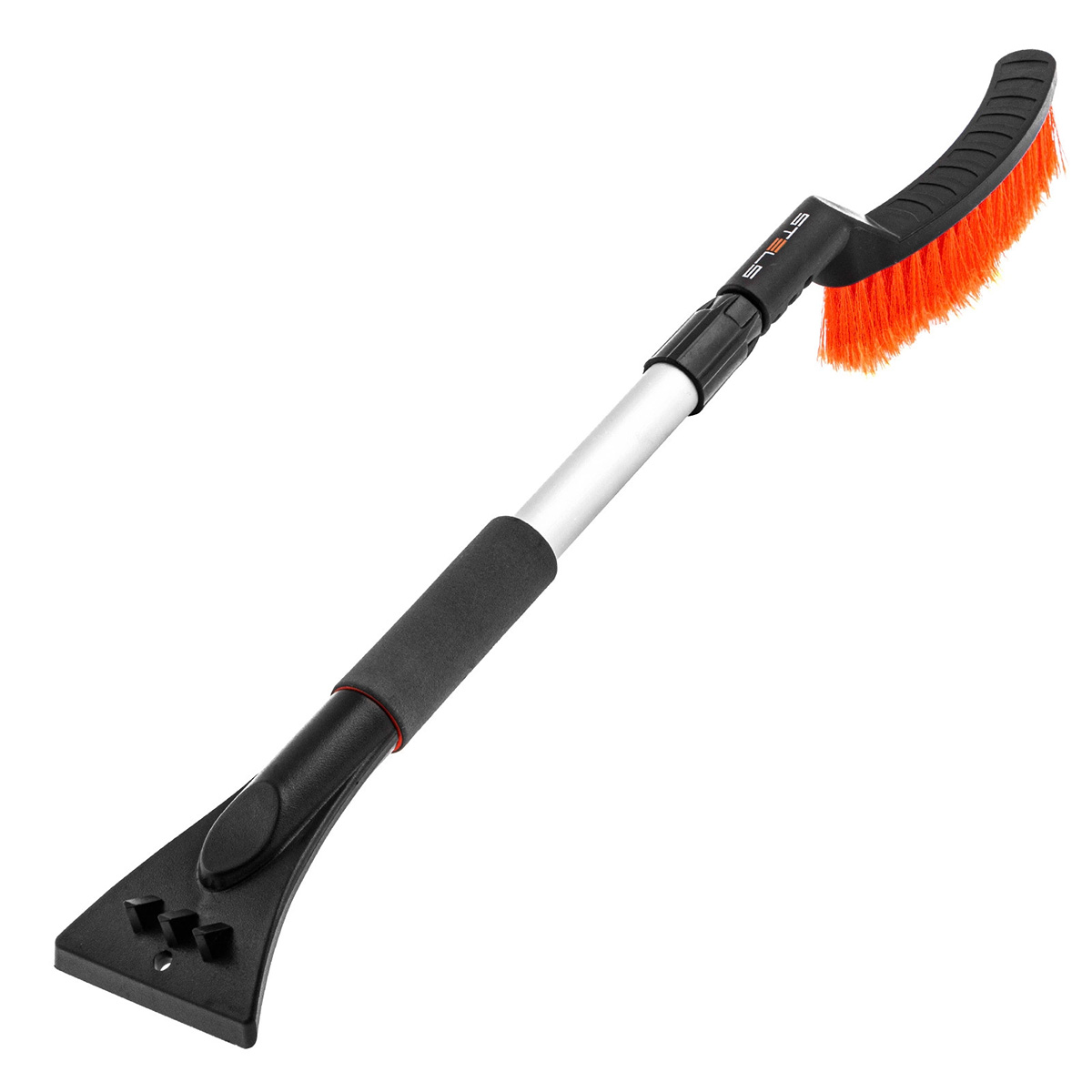 Щетка Stels оснащена регулируемой телескопической ручкой длиной от 725 до 1005 мм, что позволяет комфортно работать с автомобилем любой высоты и объёма, не наклоняясь и не замерзая. С одной стороны расположена мягкая щётка для сметания снега, с другой — прочный скребок для удаления льда и наледи. Конструкция лёгкая и прочная, обеспечивает удобство и эффективность в любых зимних условиях.