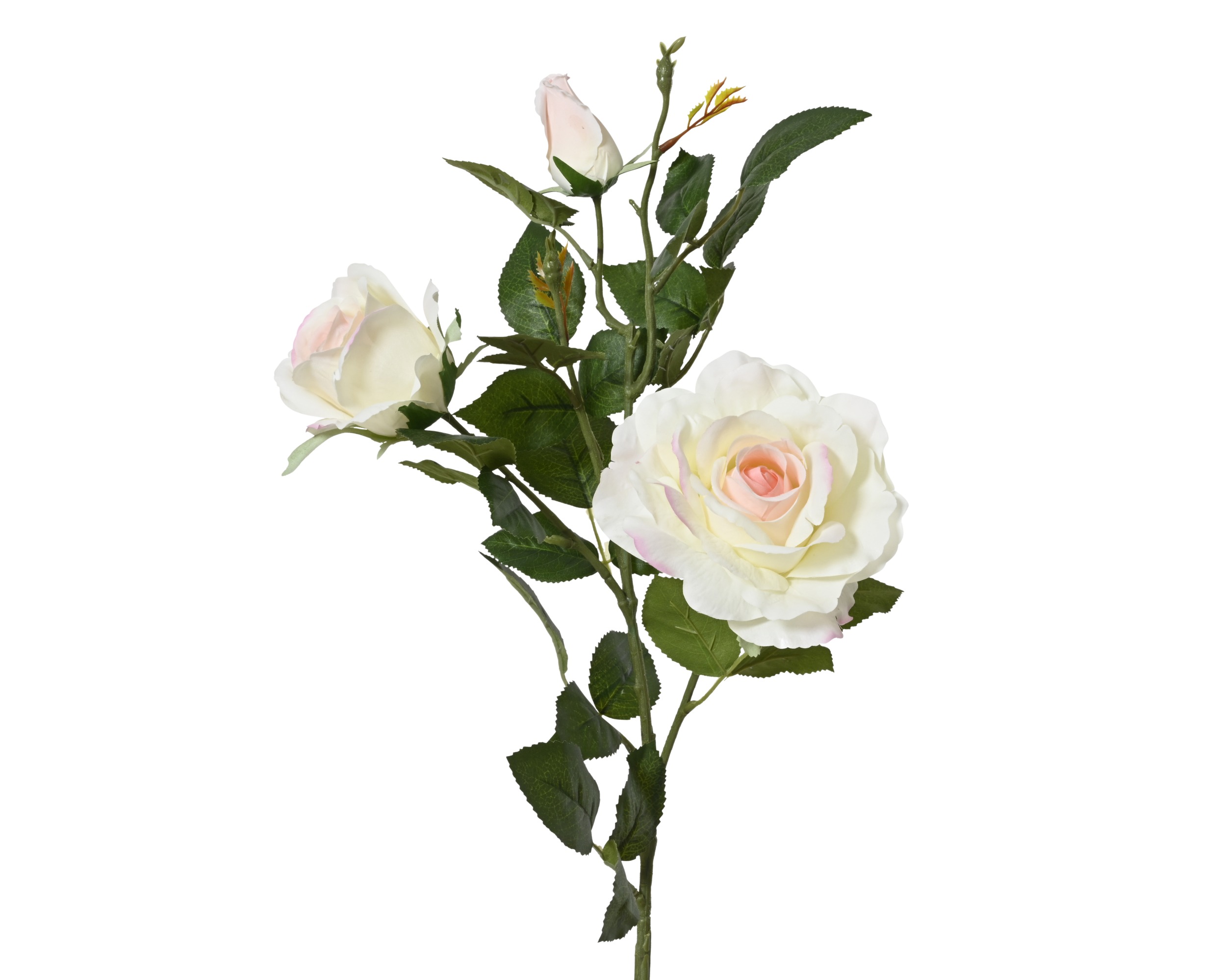 Реалистичный вид: Пышный многослойный бутон кремового цвета дополнен полураскрытыми цветами и молодыми бутонами, что создает эффект живого, только что срезанного растения.